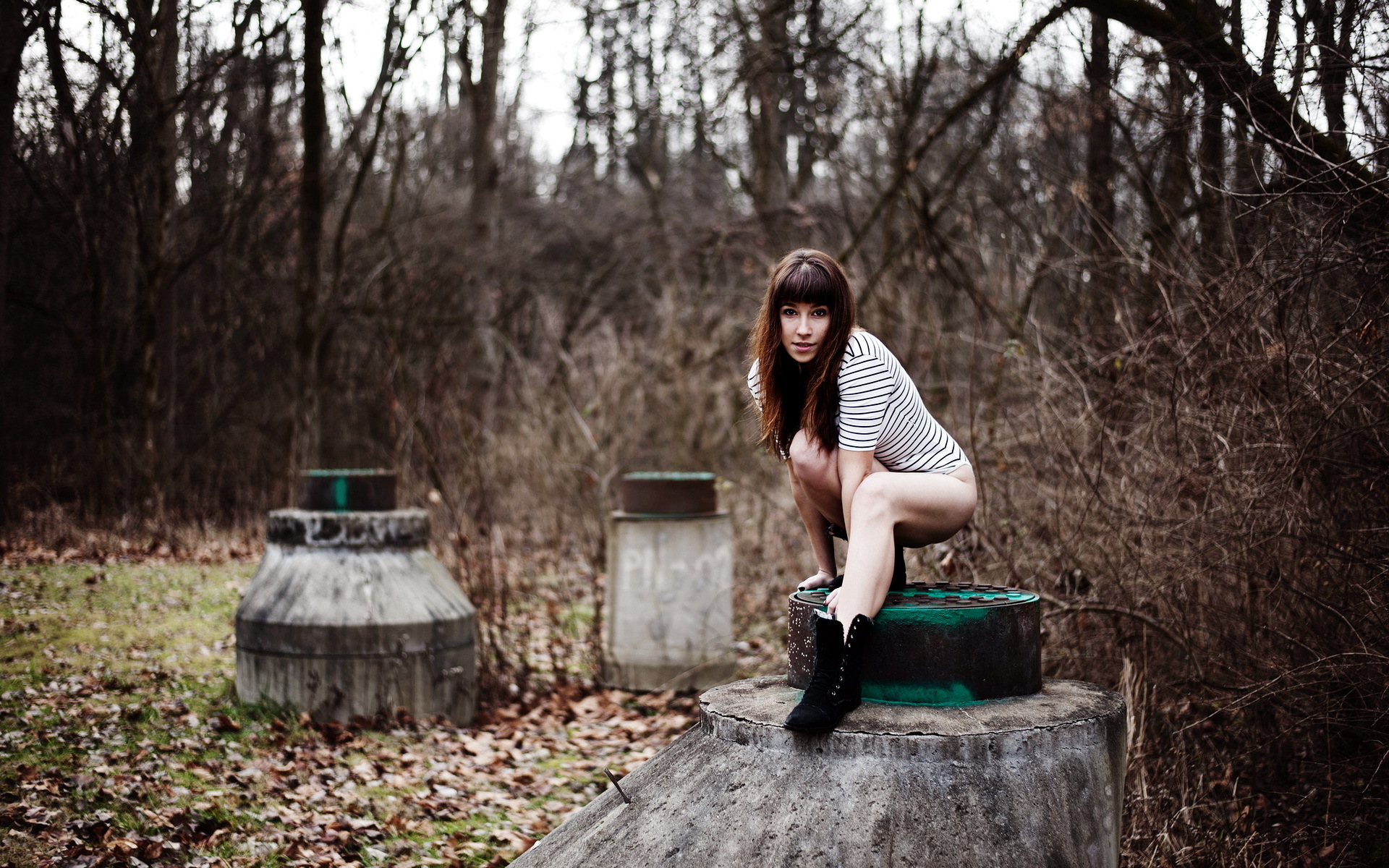 Description: A woman in a striped shirt and boots posing on a stump in a forest with trees and bushes behind her.