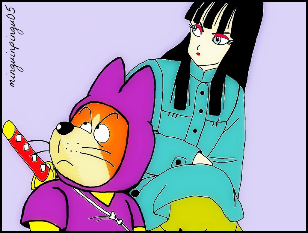 Description: A woman sitting next to a stuffed animal on a purple background with a cat on it's lap.
