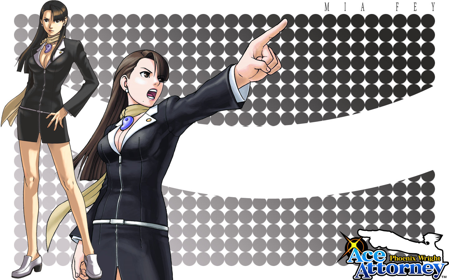 Description: A woman in a suit pointing at a man in a suit with a gun in his hand and another woman in a black suit behind her.