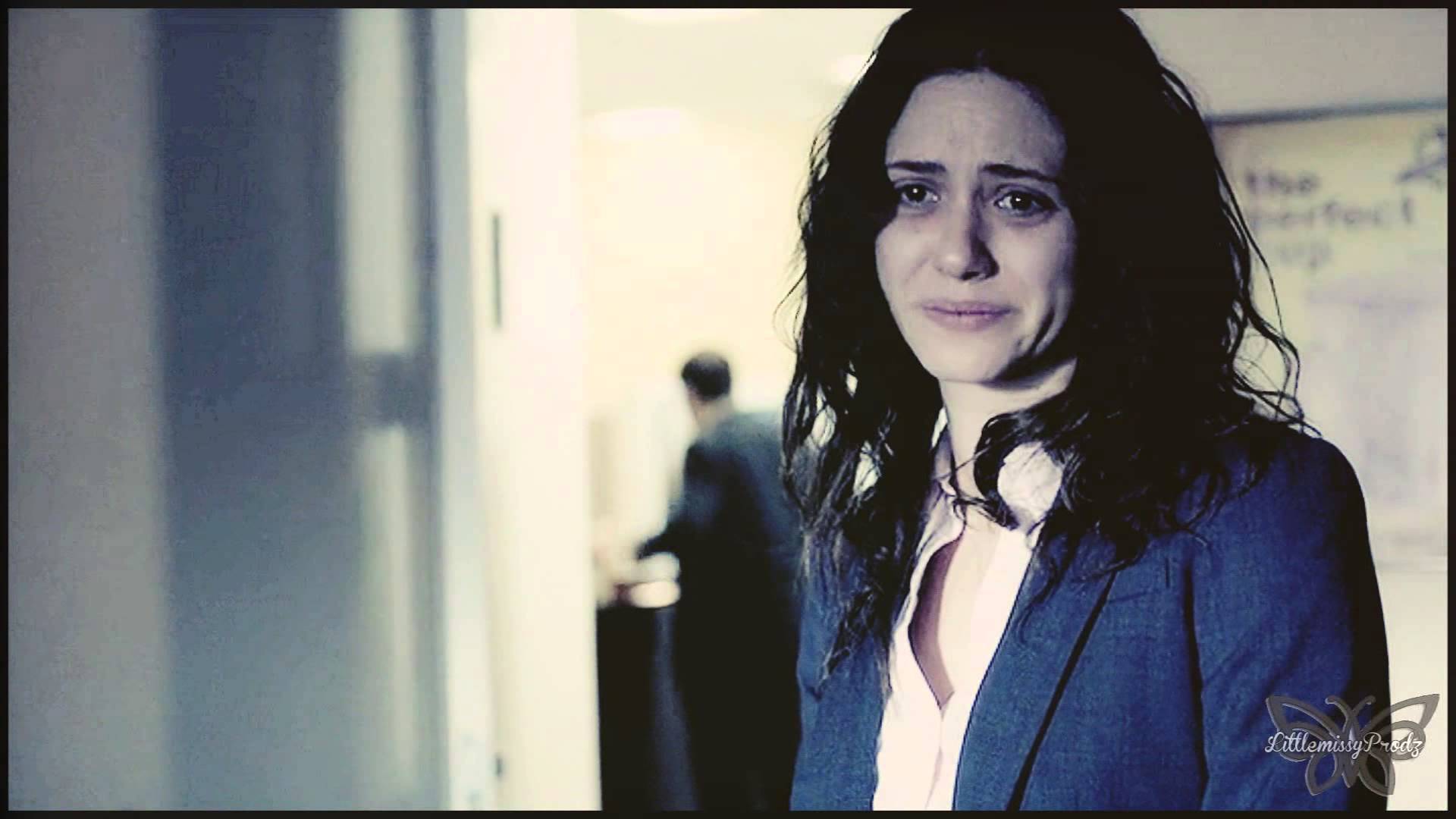 Description: A woman in a suit and tie standing in a hallway with a man in the background looking at the camera.