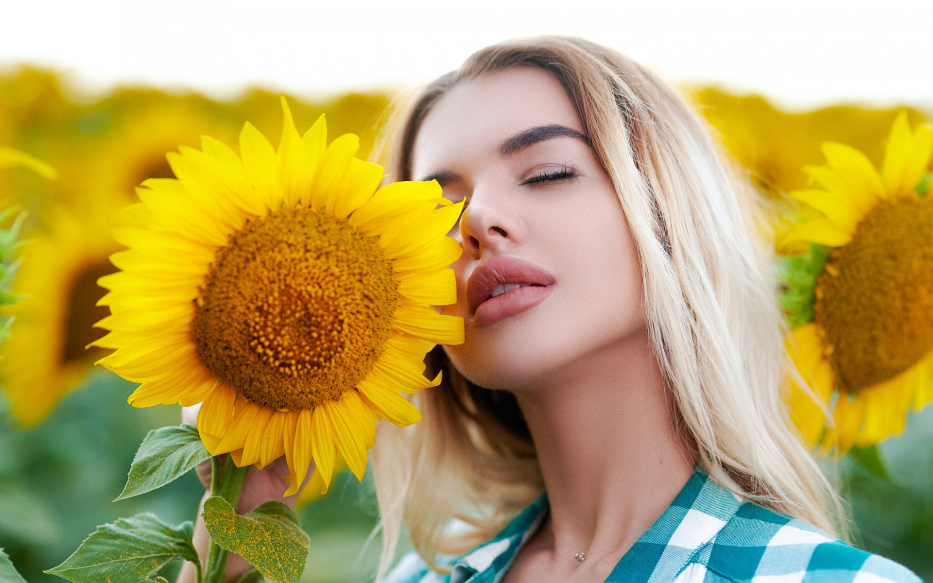 Description: A woman is smelling a sunflower in a field of sunflowers with her eyes closed and her eyes closed.