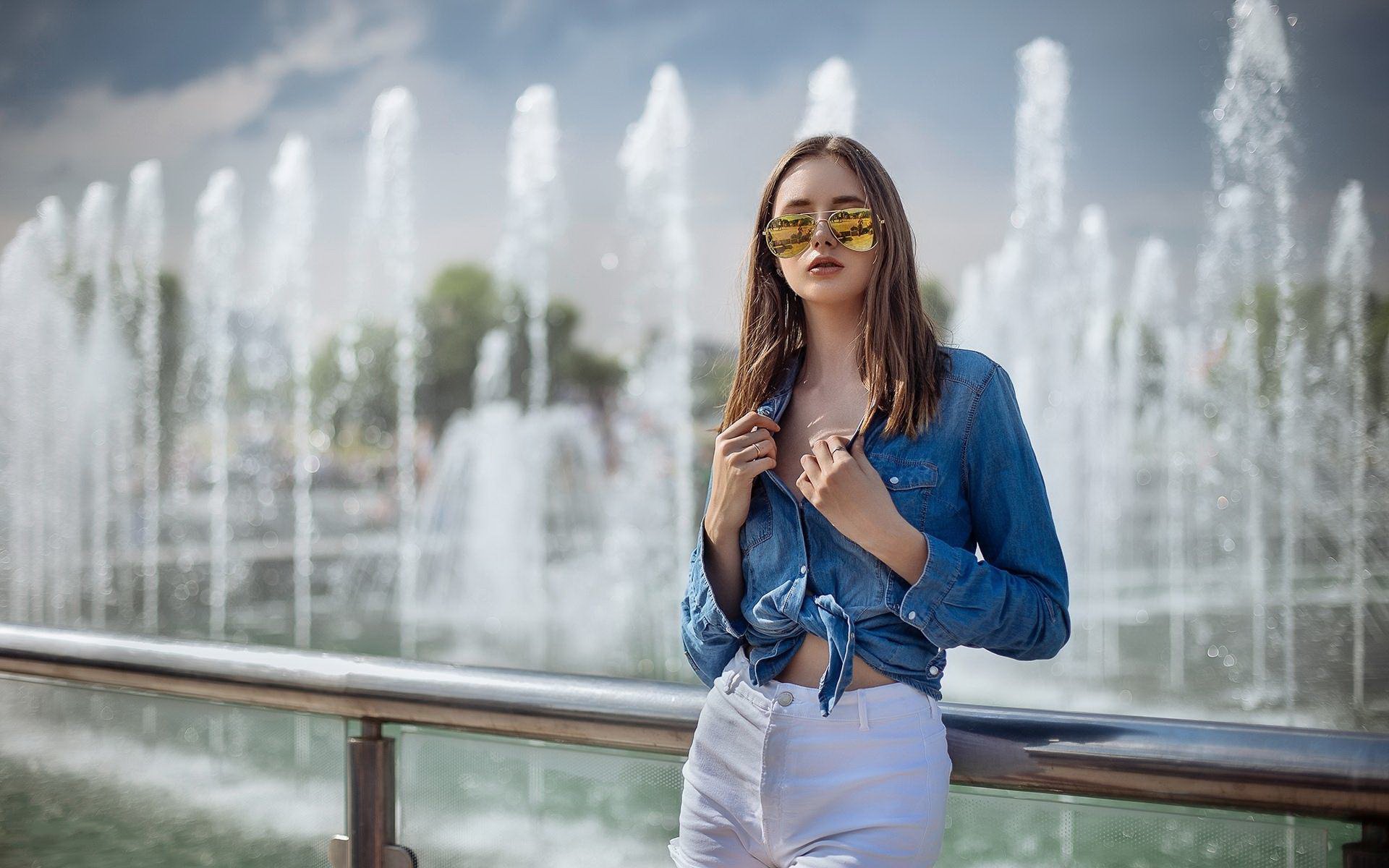 Description: A woman in sunglasses standing in front of a fountain of water with fountains behind her and a blue shirt on.