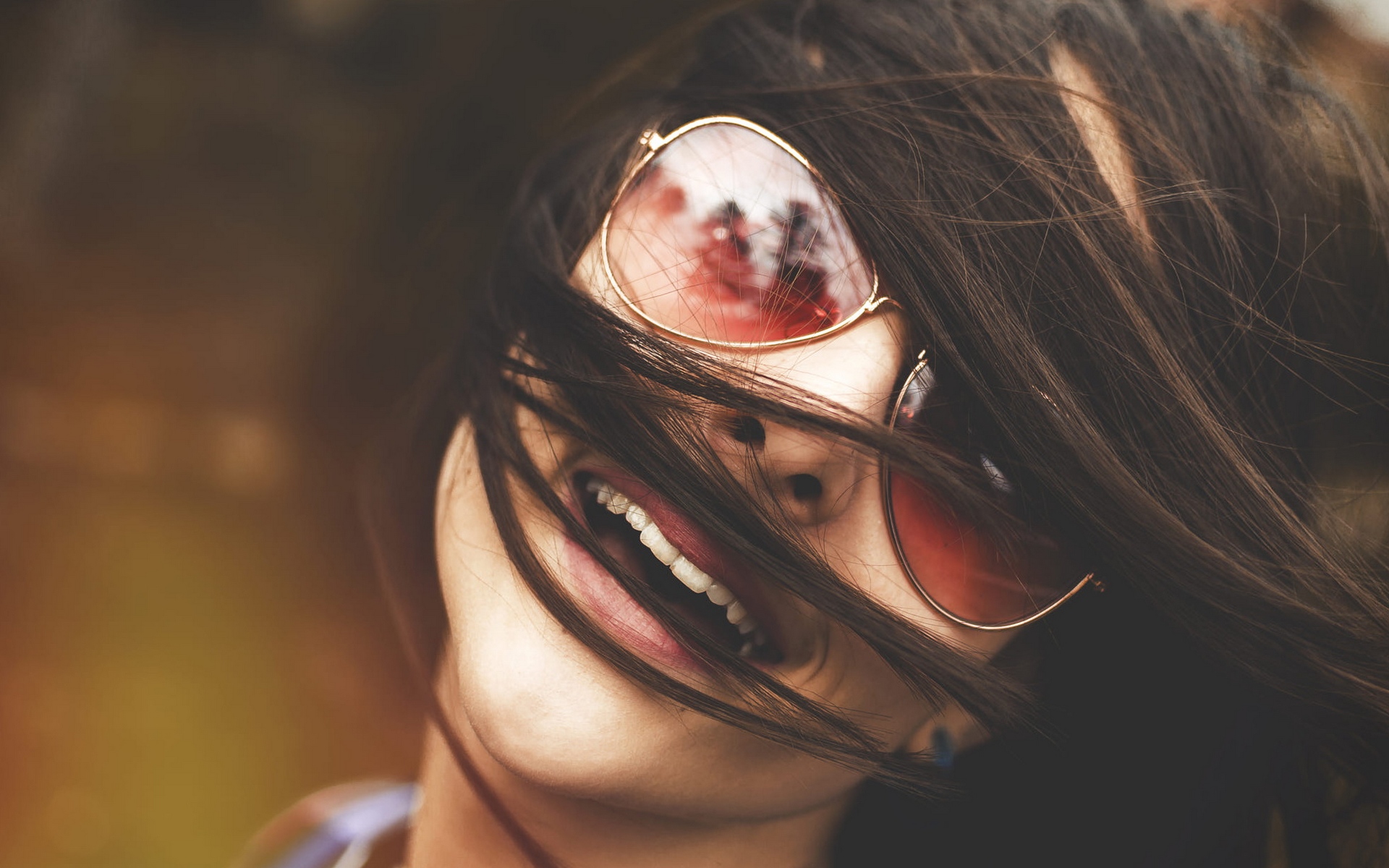Description: A woman with sunglasses on her face and hair blowing in the wind.