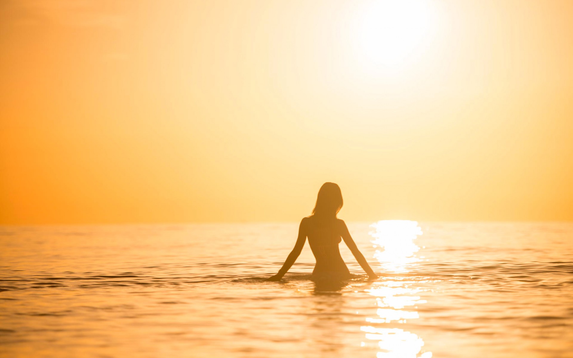 Description: A woman sitting on a surfboard in the ocean at sunset or dawn.