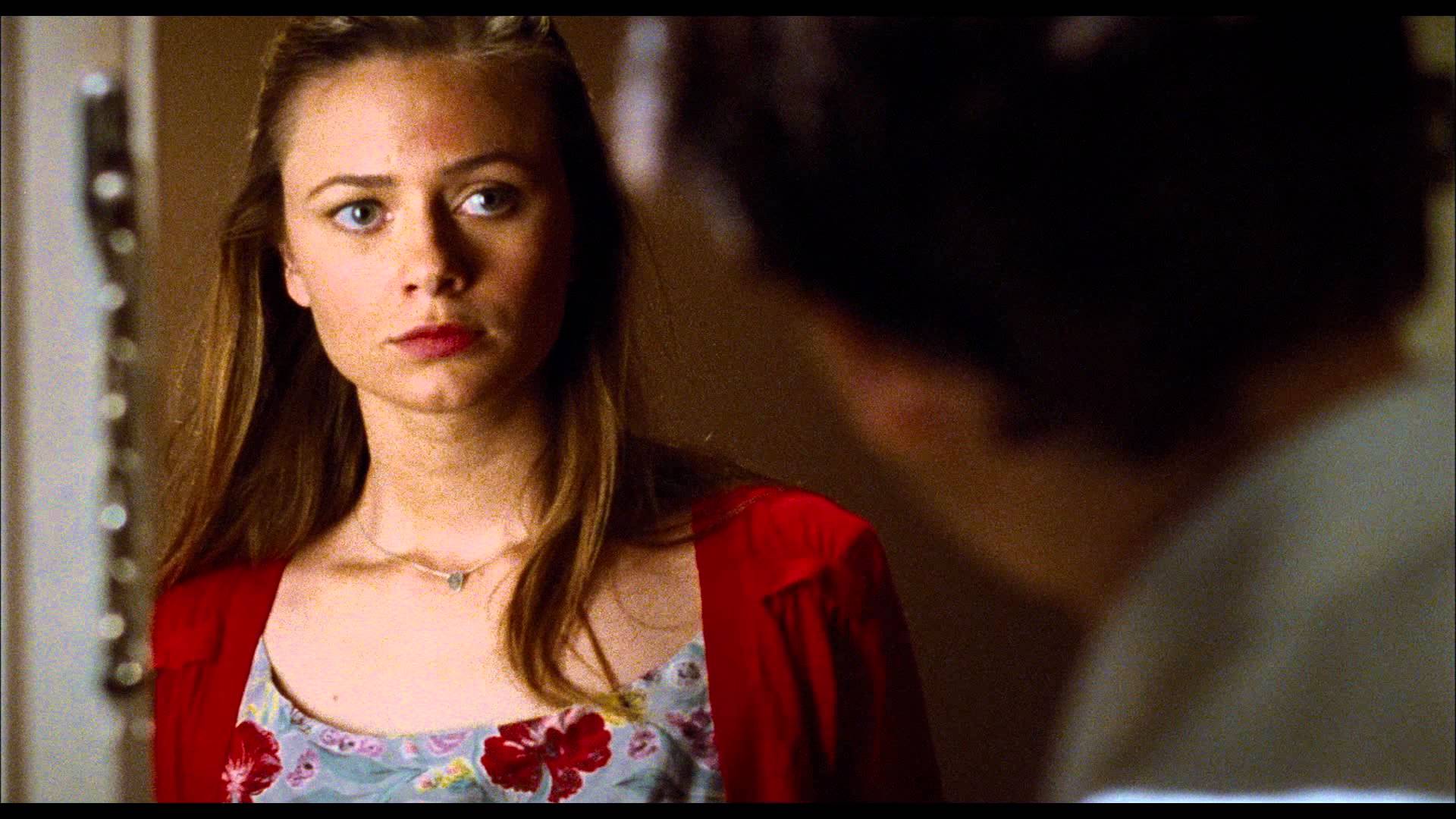 Description: A woman looking at herself in a mirror with a surprised look on her face and a man in the background.