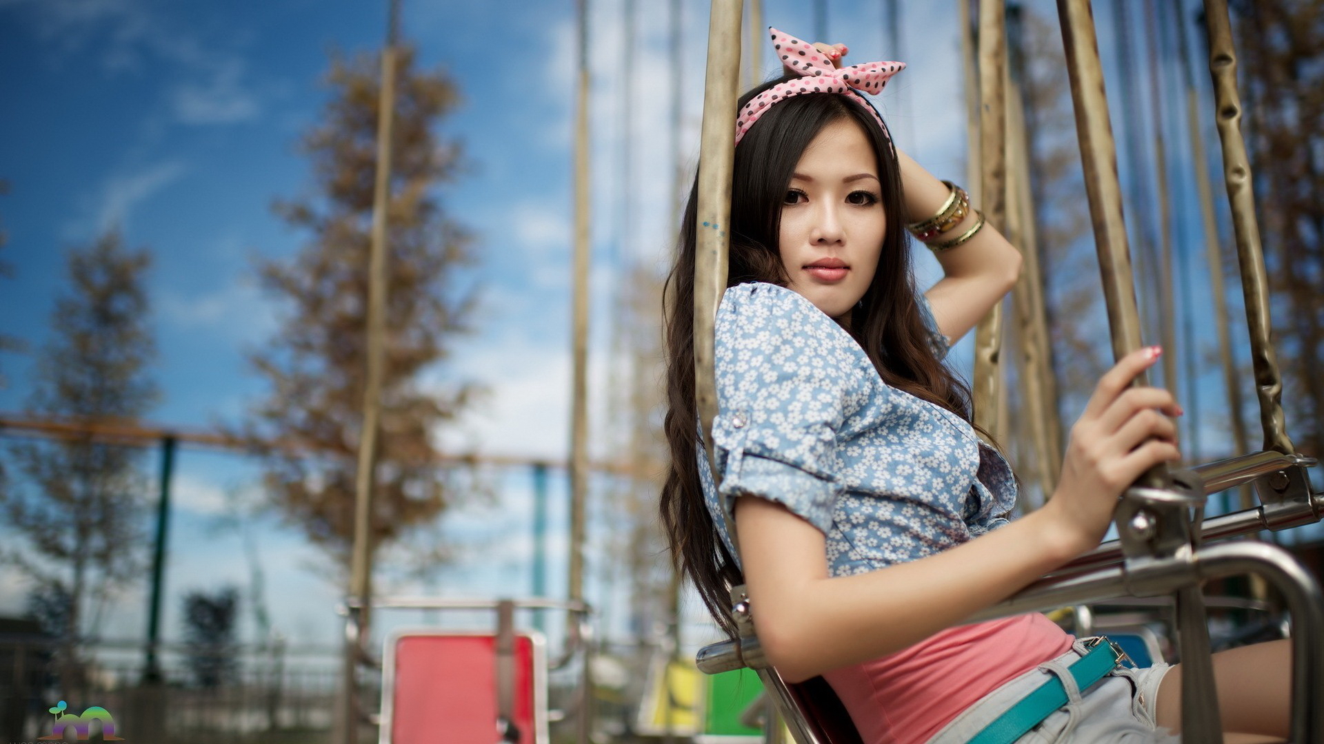 Description: A woman sitting on a swing in a park with a pink bow on her head and a blue sky background.