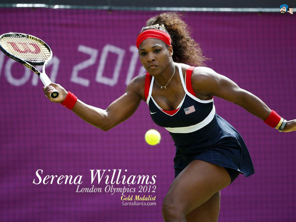 Description: A woman is swinging a tennis racket at a ball on a court with a purple background and a purple wall behind her.