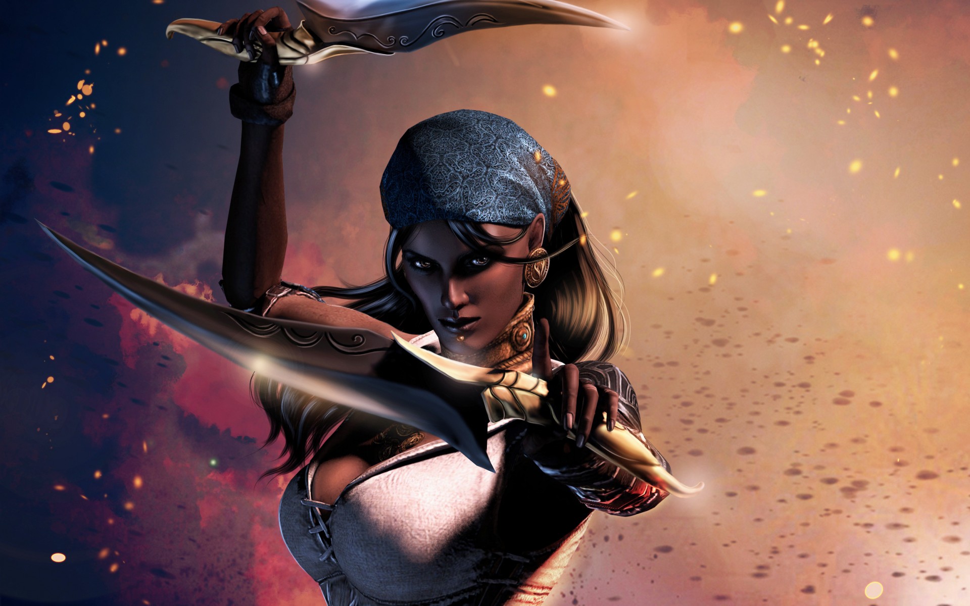 Description: A woman holding a sword and a sword in her hand with a sky background behind her and a star in the sky.