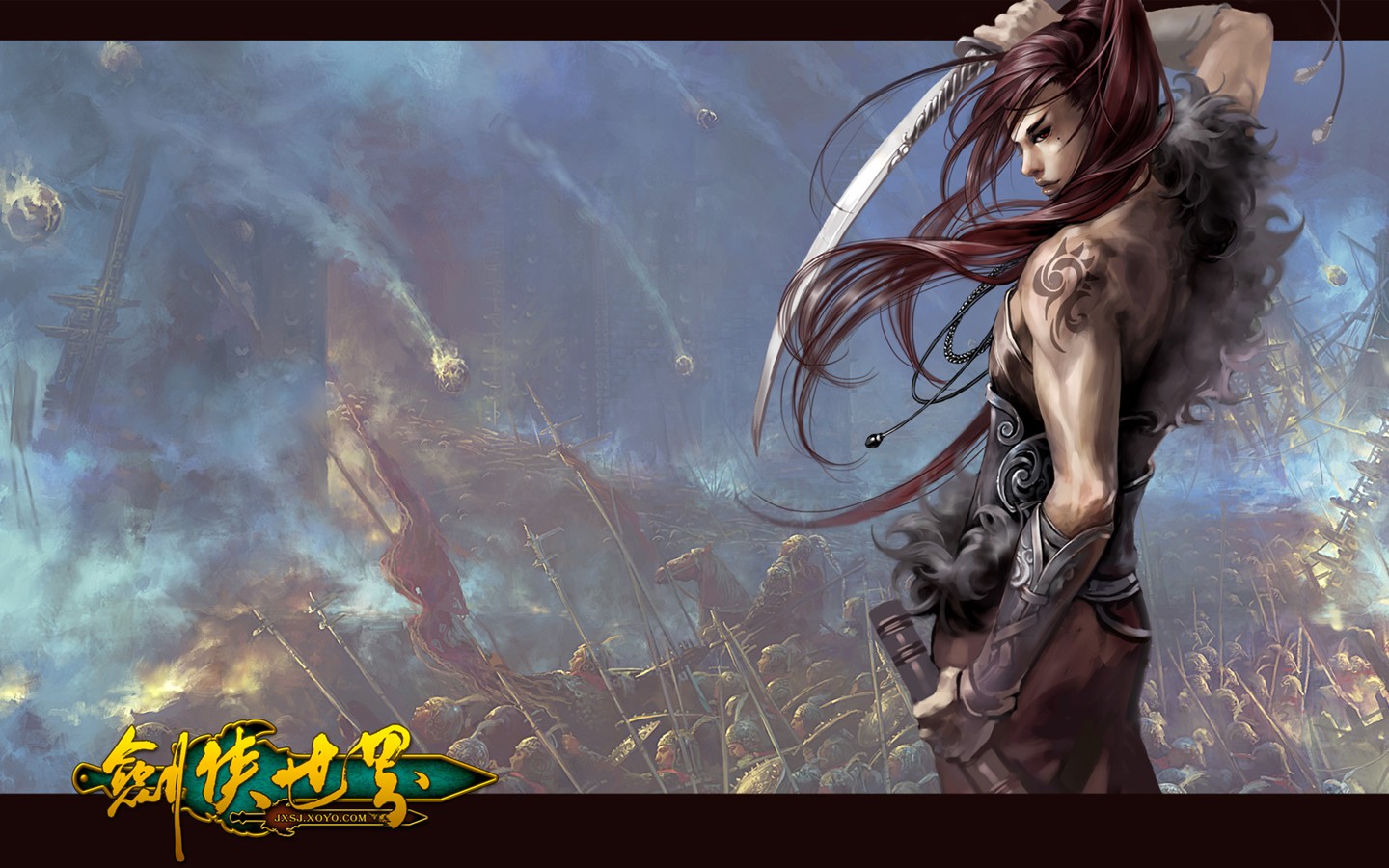 Description: A woman with a sword in her hand and a lot of people in the background in the background are a painting of a battle.
