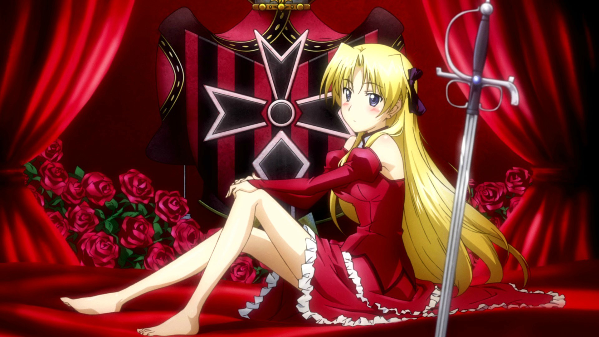 Description: A woman sitting on a bed with a sword and a sword in her hand and a red rose behind her.