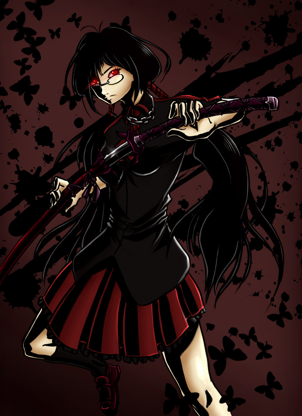 Description: A woman with a sword and blood on her face and a black dress with red stripes on her body.