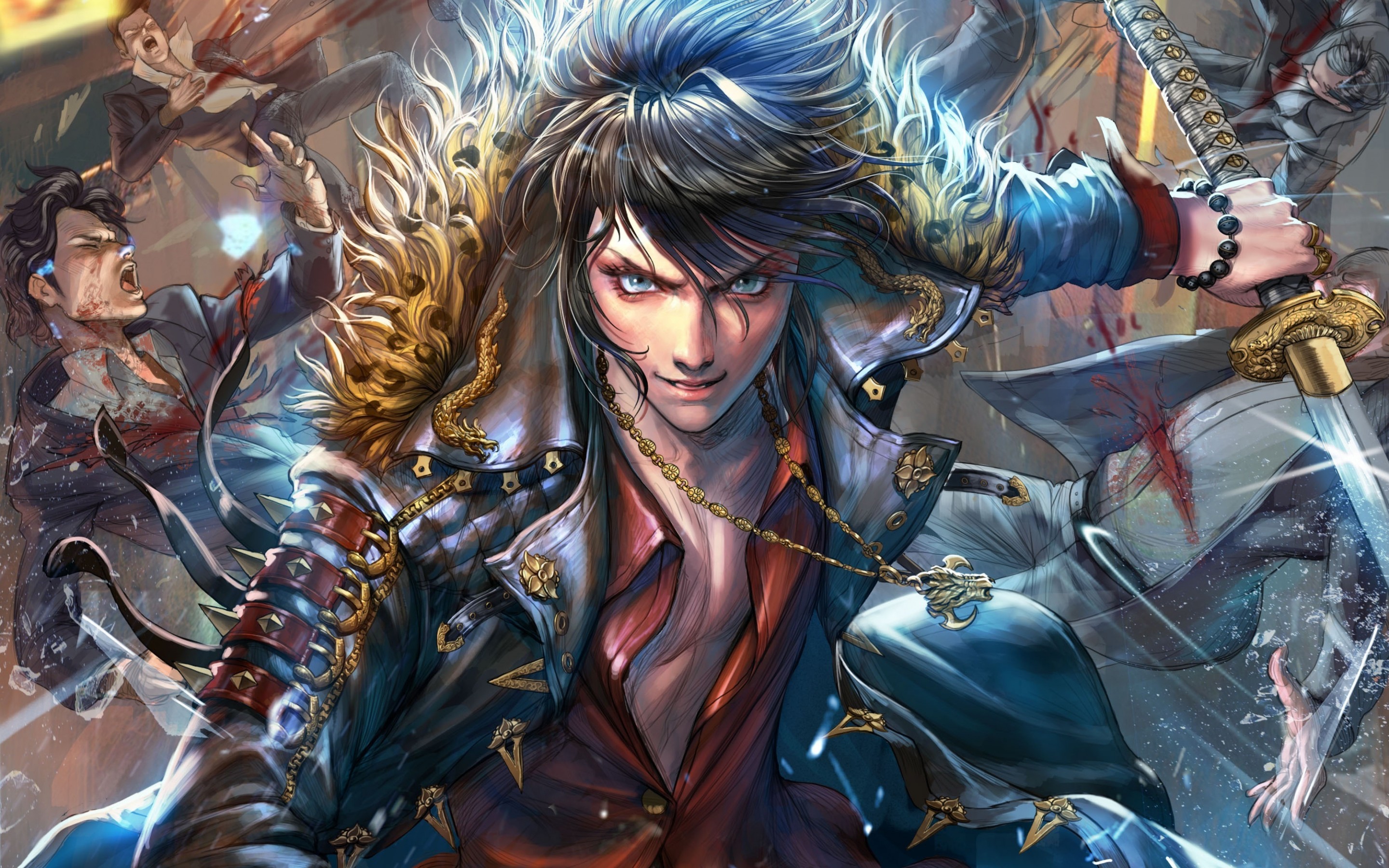 Description: A woman with a sword and a bunch of other people behind her in a video game artwork style image.
