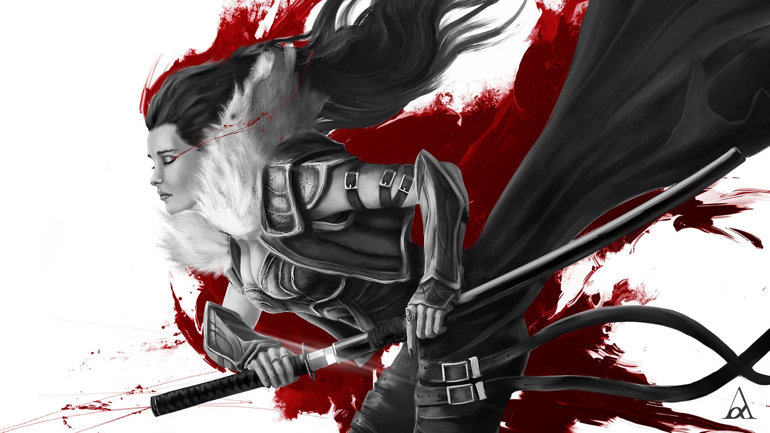 Description: A woman with a sword and a blood splattered background is depicted in this artistic illustration of a woman with a sword.