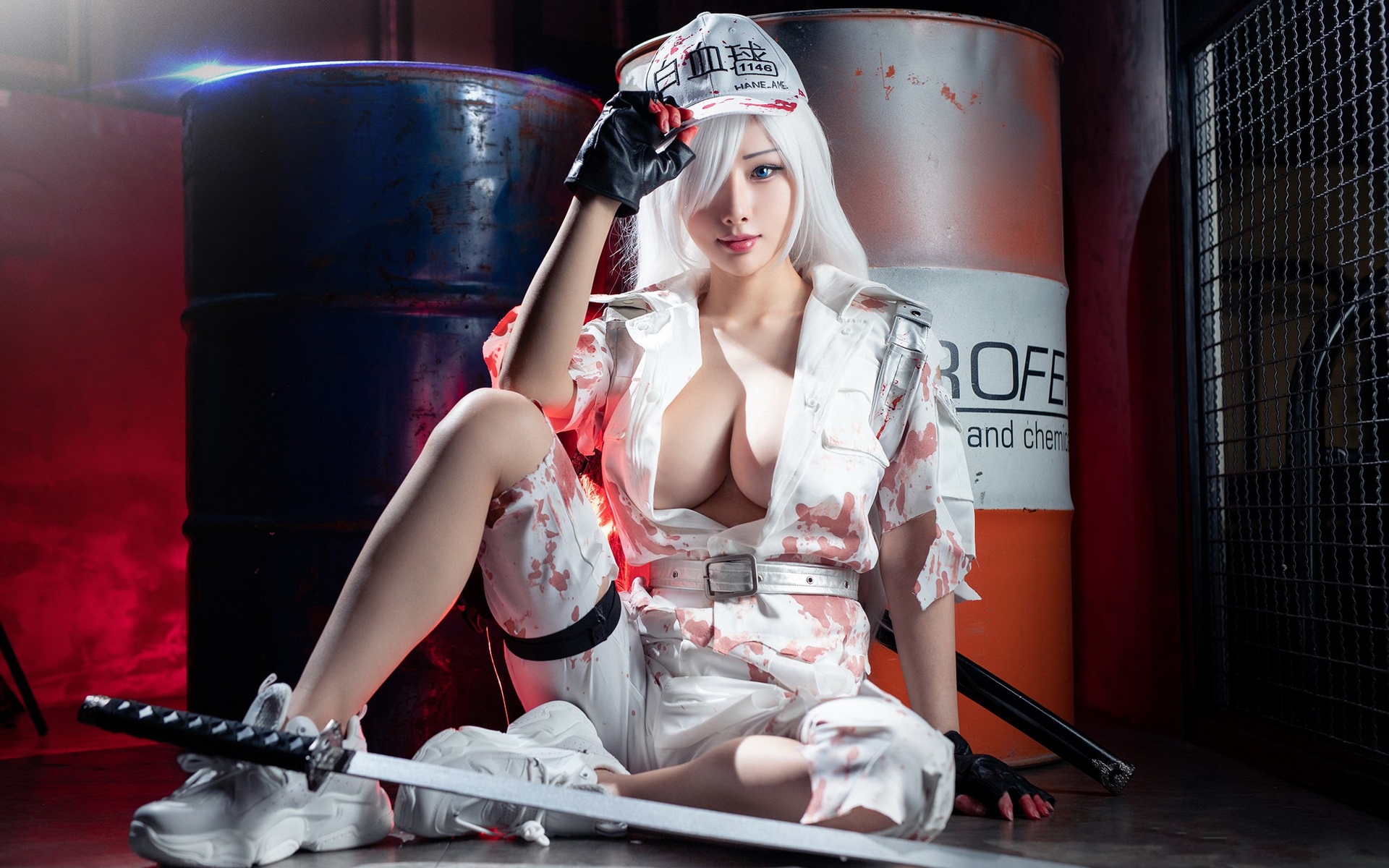 Description: A woman in a white outfit with a sword and blood on her body sitting on a floor next to a barrel.