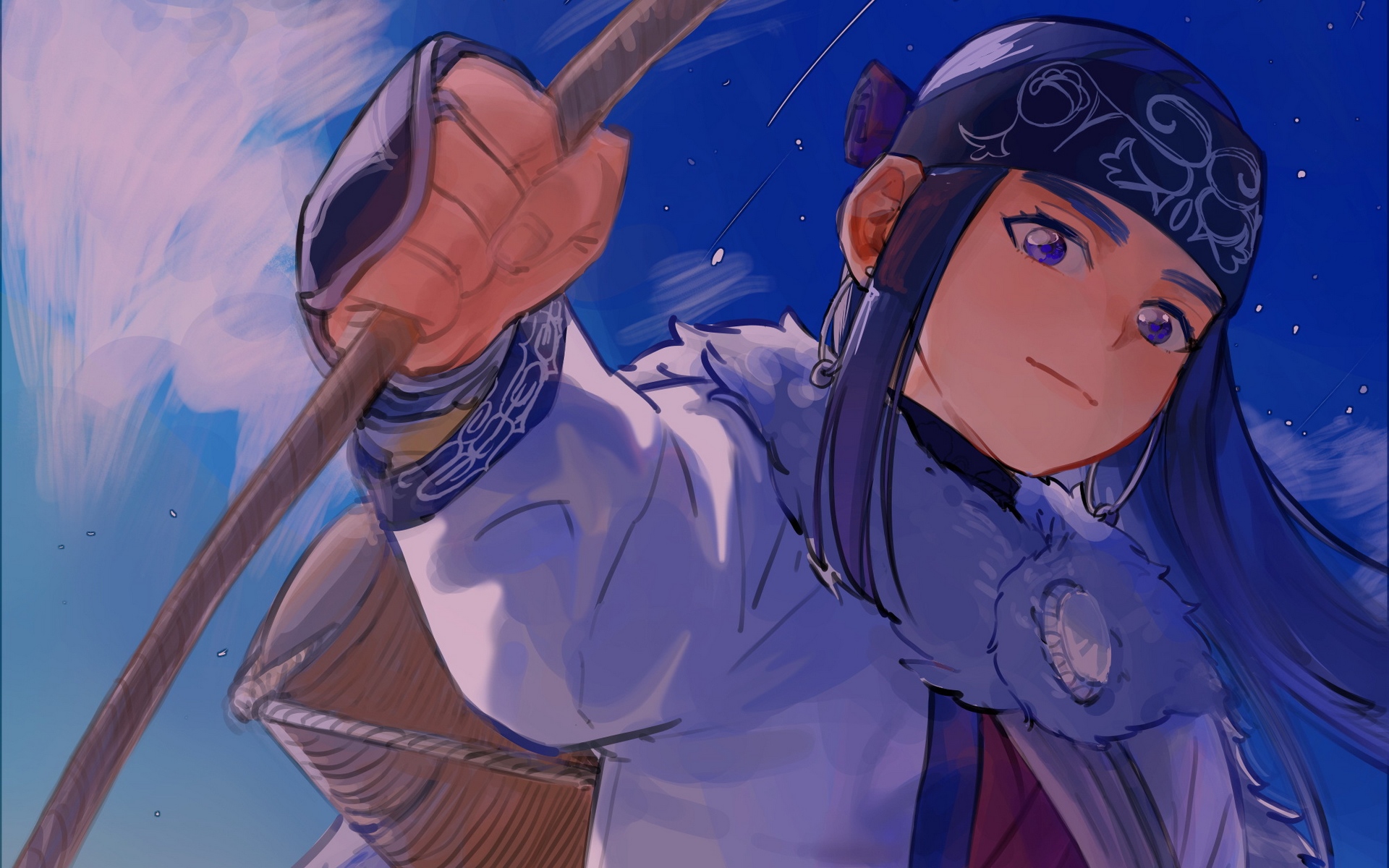 Description: A woman in a white shirt holding a sword and a blue sky background with clouds and stars in the background.