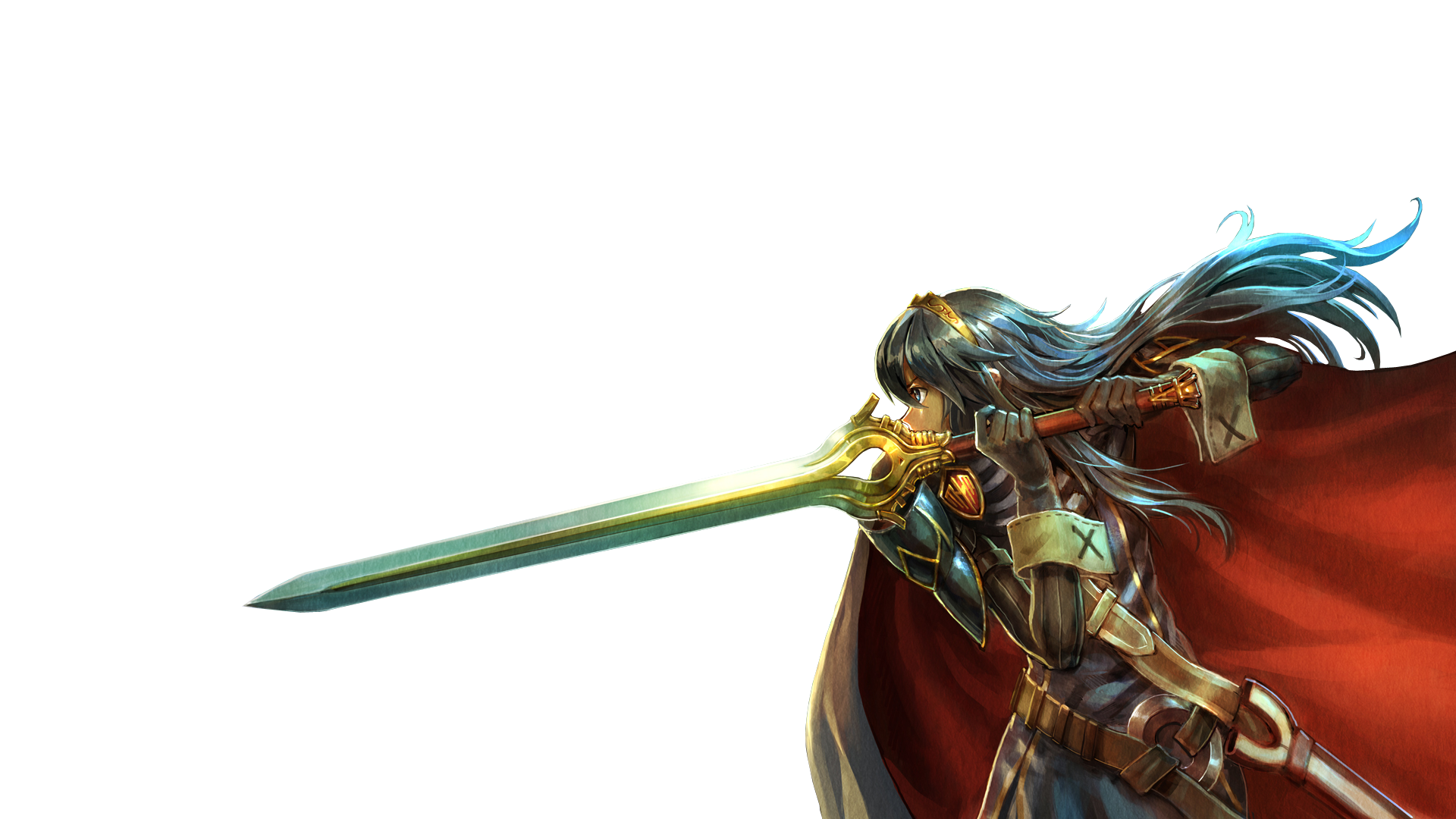 Description: A woman with a sword and a cape on her head and a sword in her hand.
