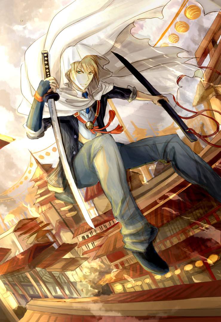Description: A woman with a sword in her hand and a city in the background with buildings and clouds in the sky.