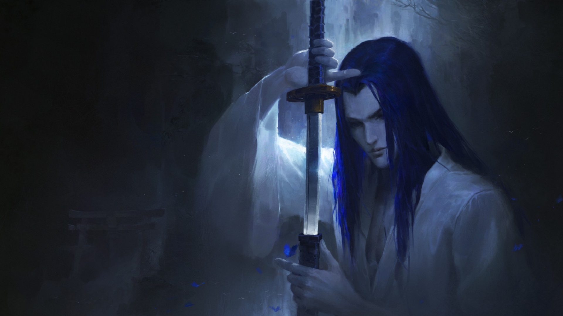 Description: A woman holding a sword in a dark forest with a light shining on her face and a dark background.