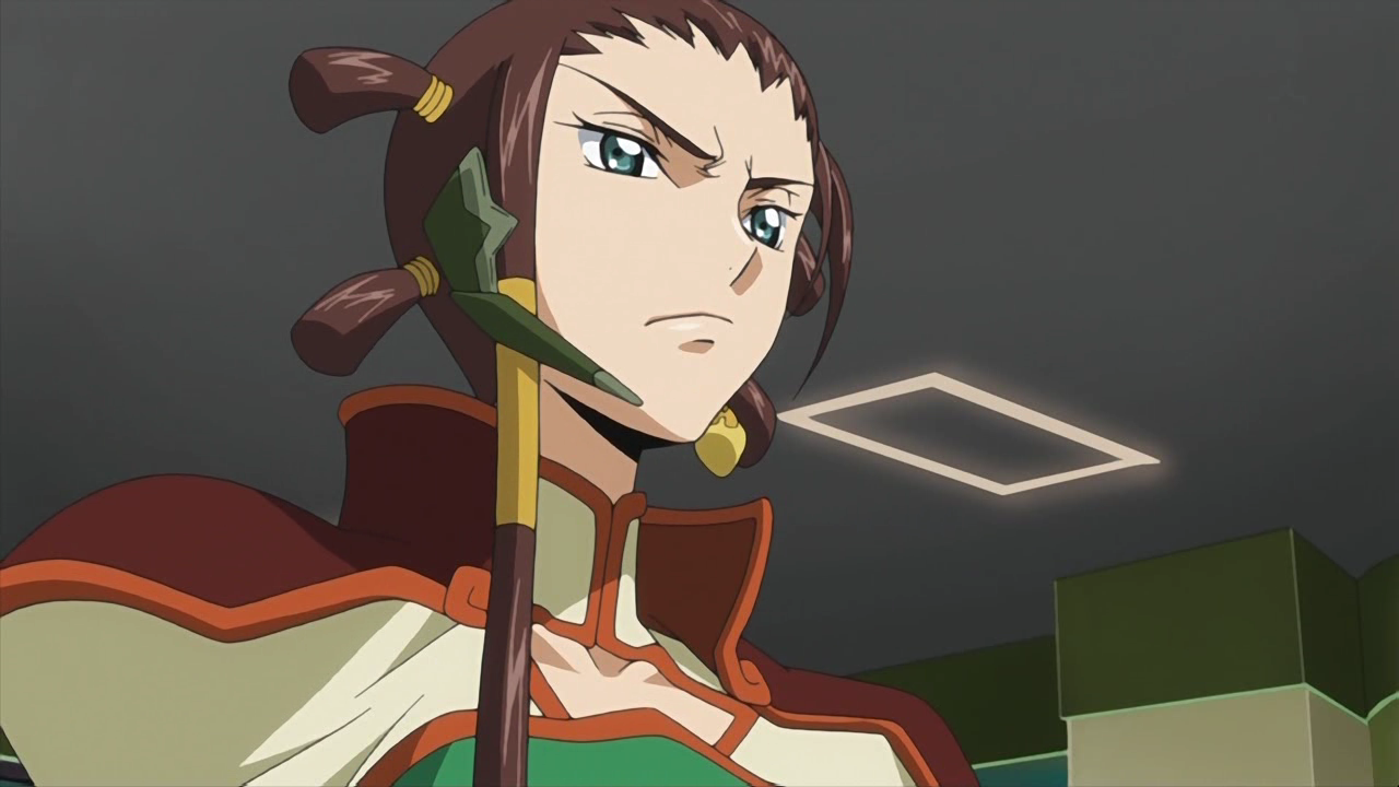 Description: A woman with a sword in a room with a dark background and a box in the background that says.