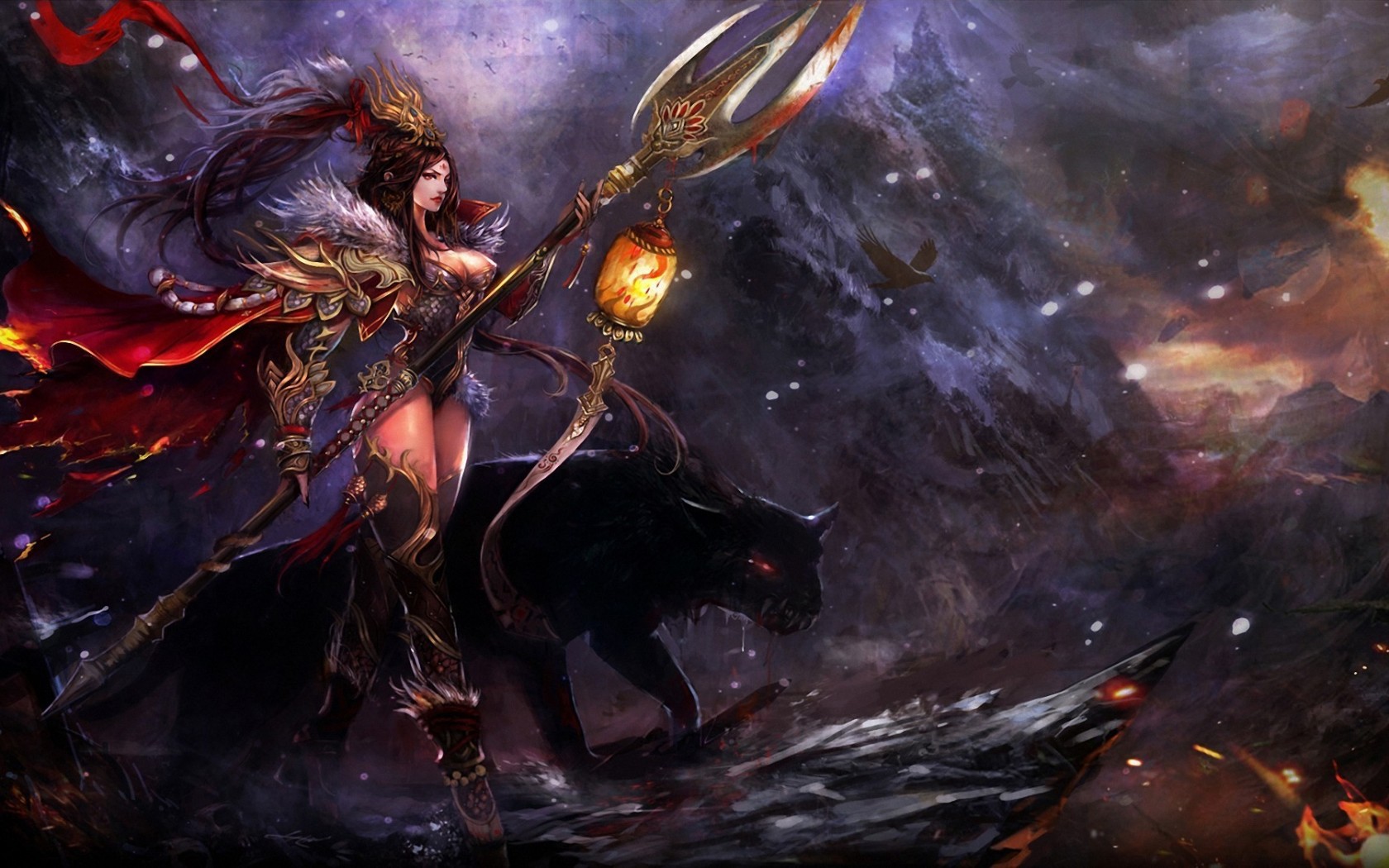 Description: A woman with a sword and a demon on a mountain with a light in her hand and a demon on her shoulder.