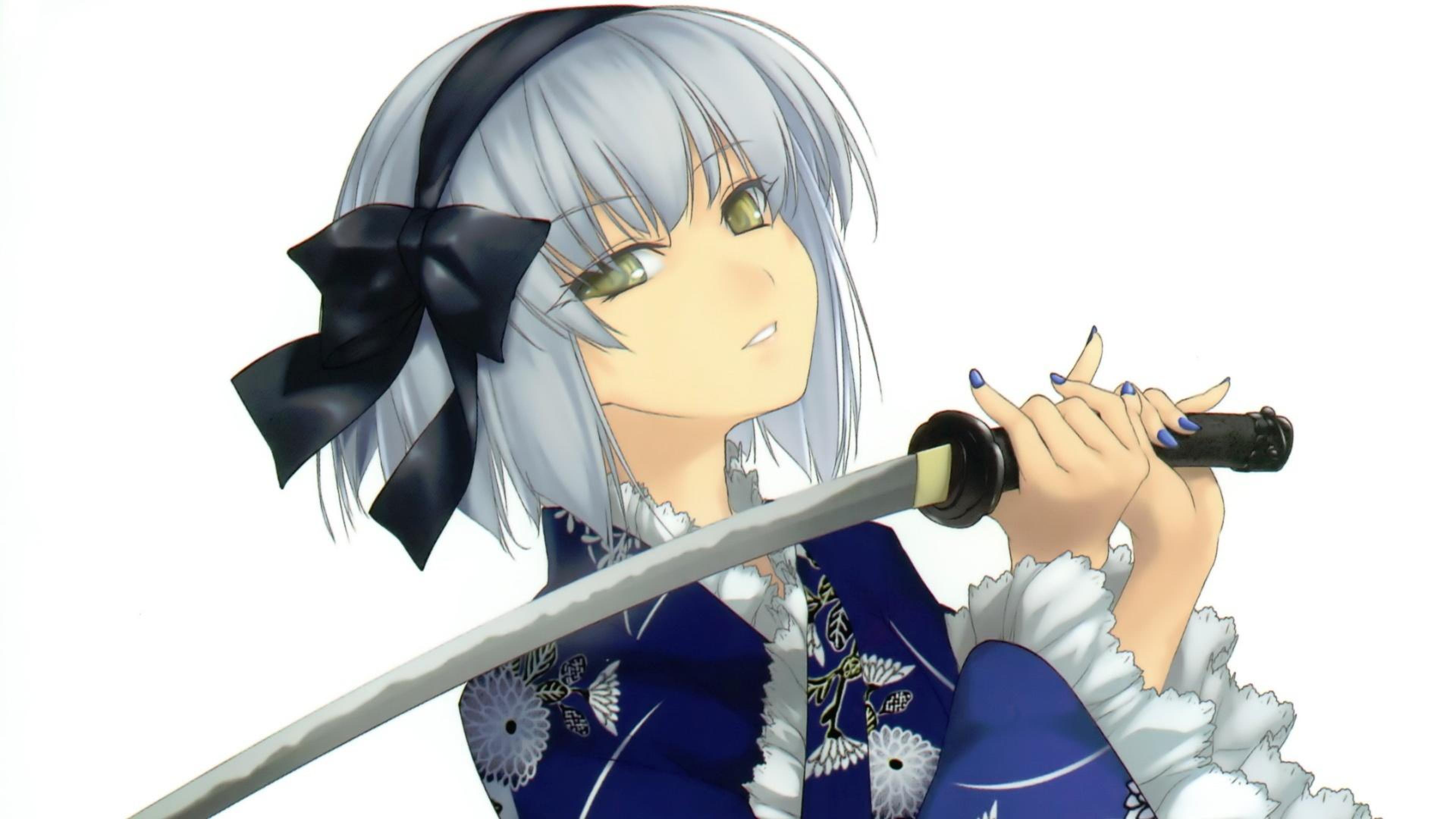 Description: A woman with a sword and a dress on holding a sword in her hand and looking at the camera.