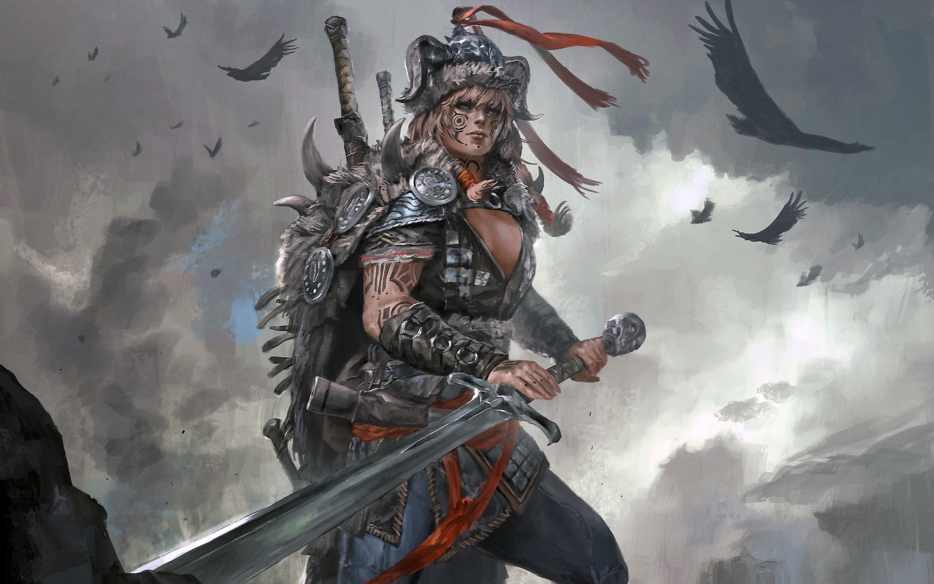 Description: A woman with a sword and a helmet on holding a sword in her hands and birds flying around her.