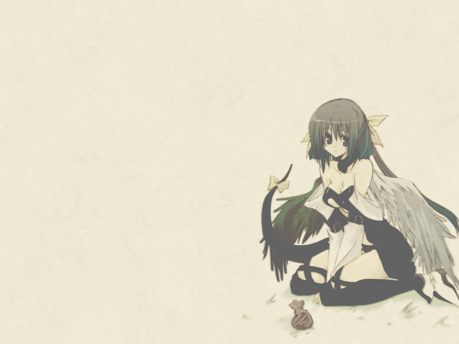 Description: A woman with a sword sitting on the ground next to a mouse and a wallpaper with a picture of a woman with wings.
