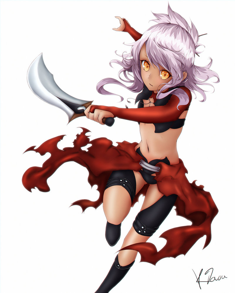 Description: A woman with a sword and a red dress on her body is running with a bloody tail and a knife in her hand.