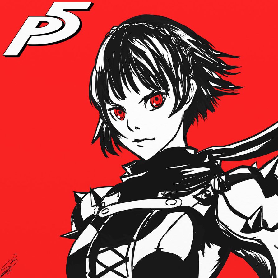 Description: A drawing of a woman with a sword in her hand and red eyes on her face.