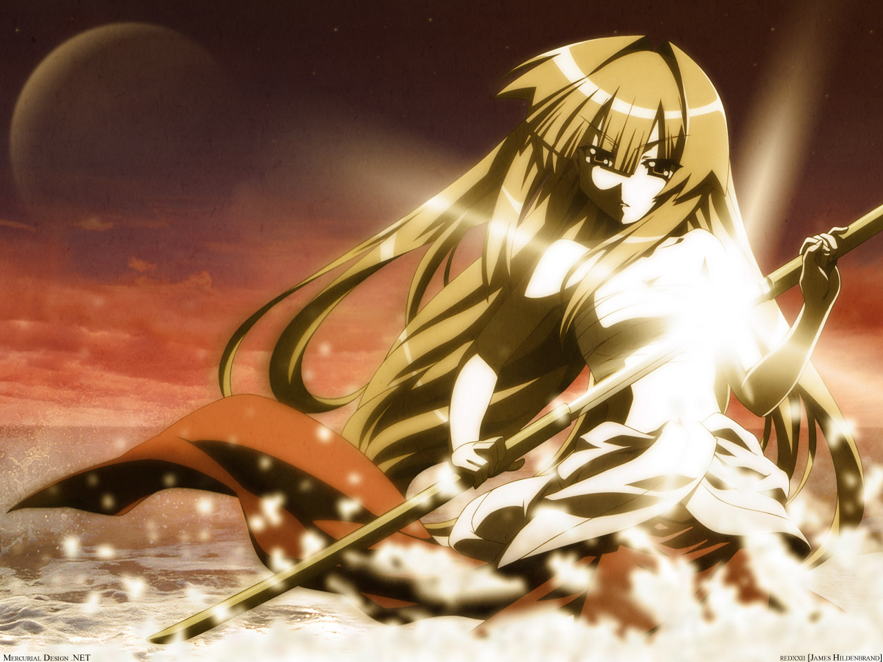 Description: A woman in a white dress holding a sword in her hand and sitting on a rock in the water.