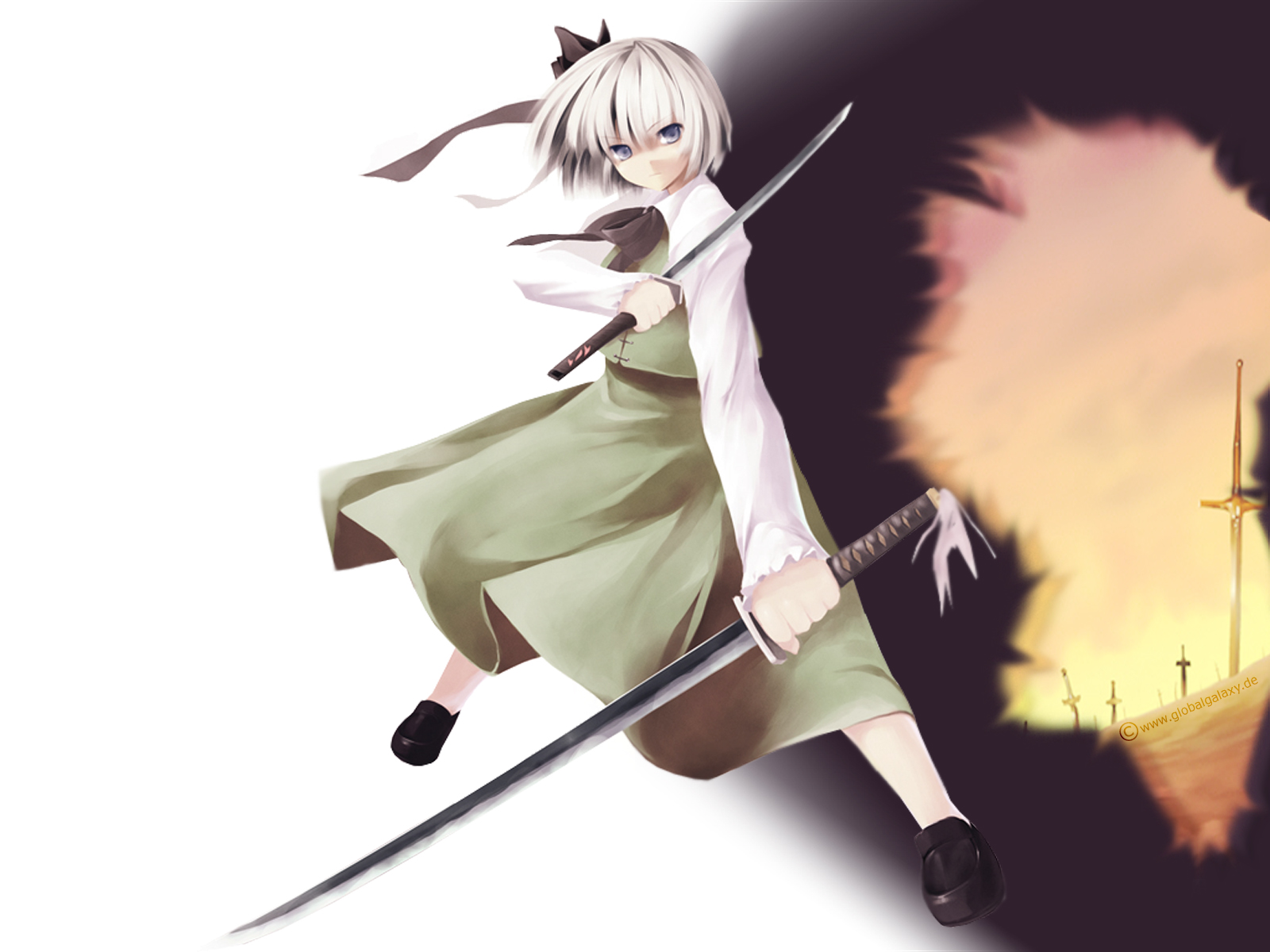 Description: A woman with a sword in her hand and a windmill in the background with a sky in the background.