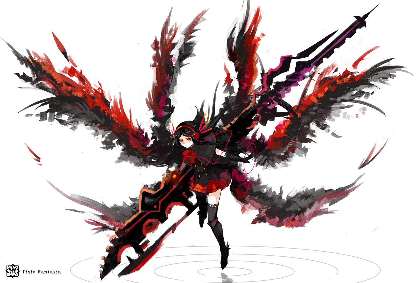 Description: A woman with a sword and wings on a white background with a red and black design on it's body.