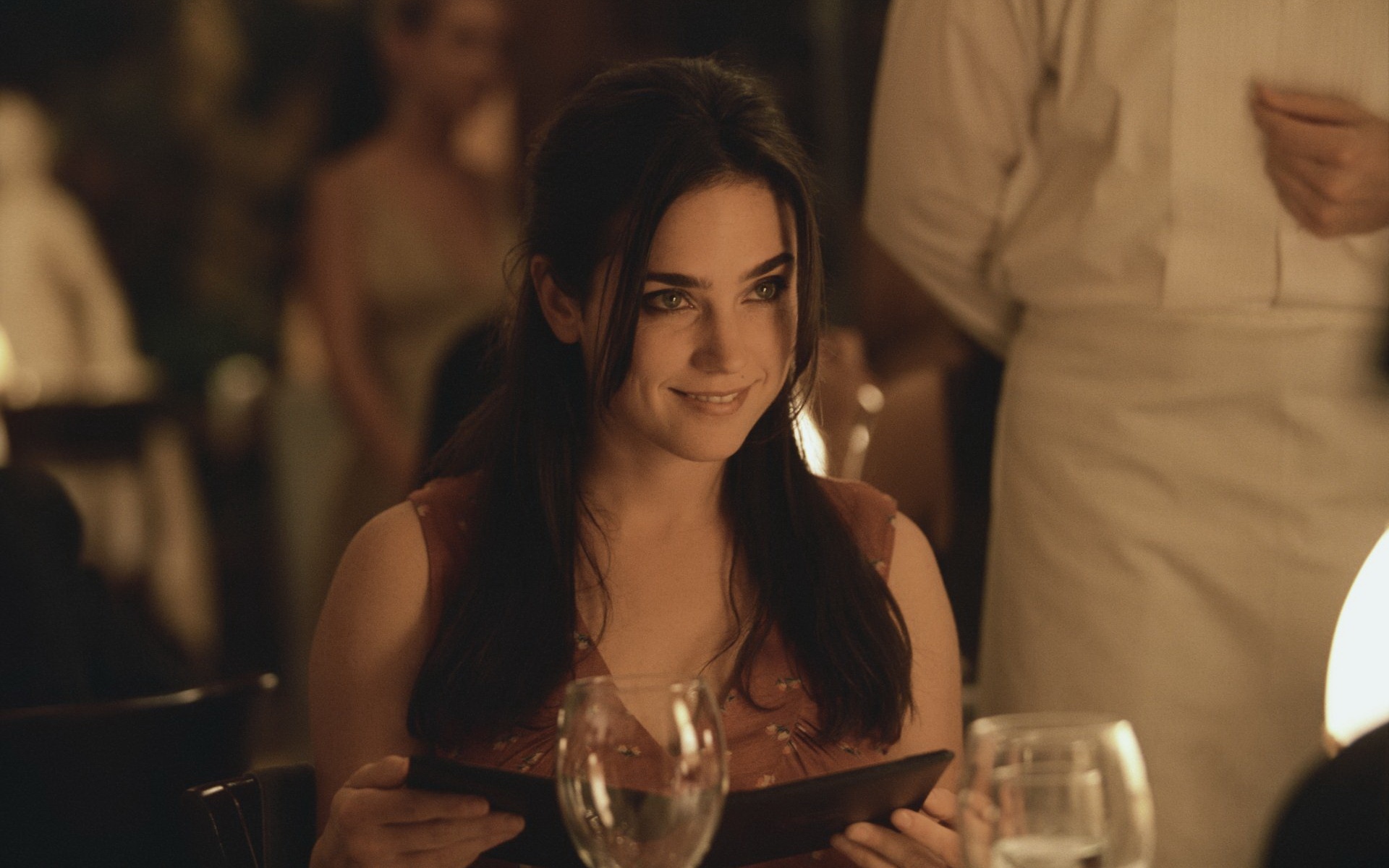 Description: A woman sitting at a table with a tablet in her hands and a man standing behind her in a white shirt.
