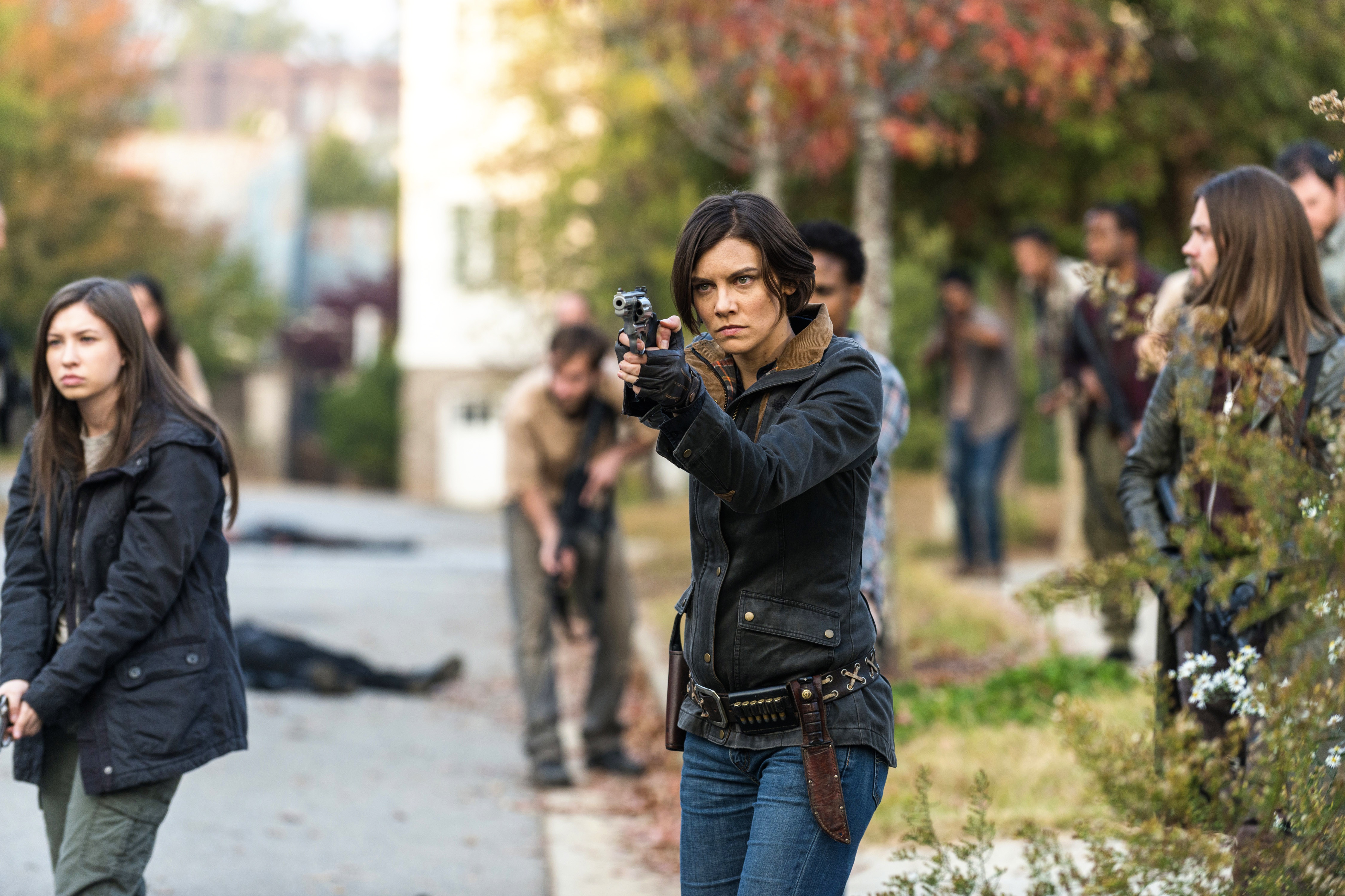 Description: A woman taking a picture of a group of people on a street corner with a camera in her hand.