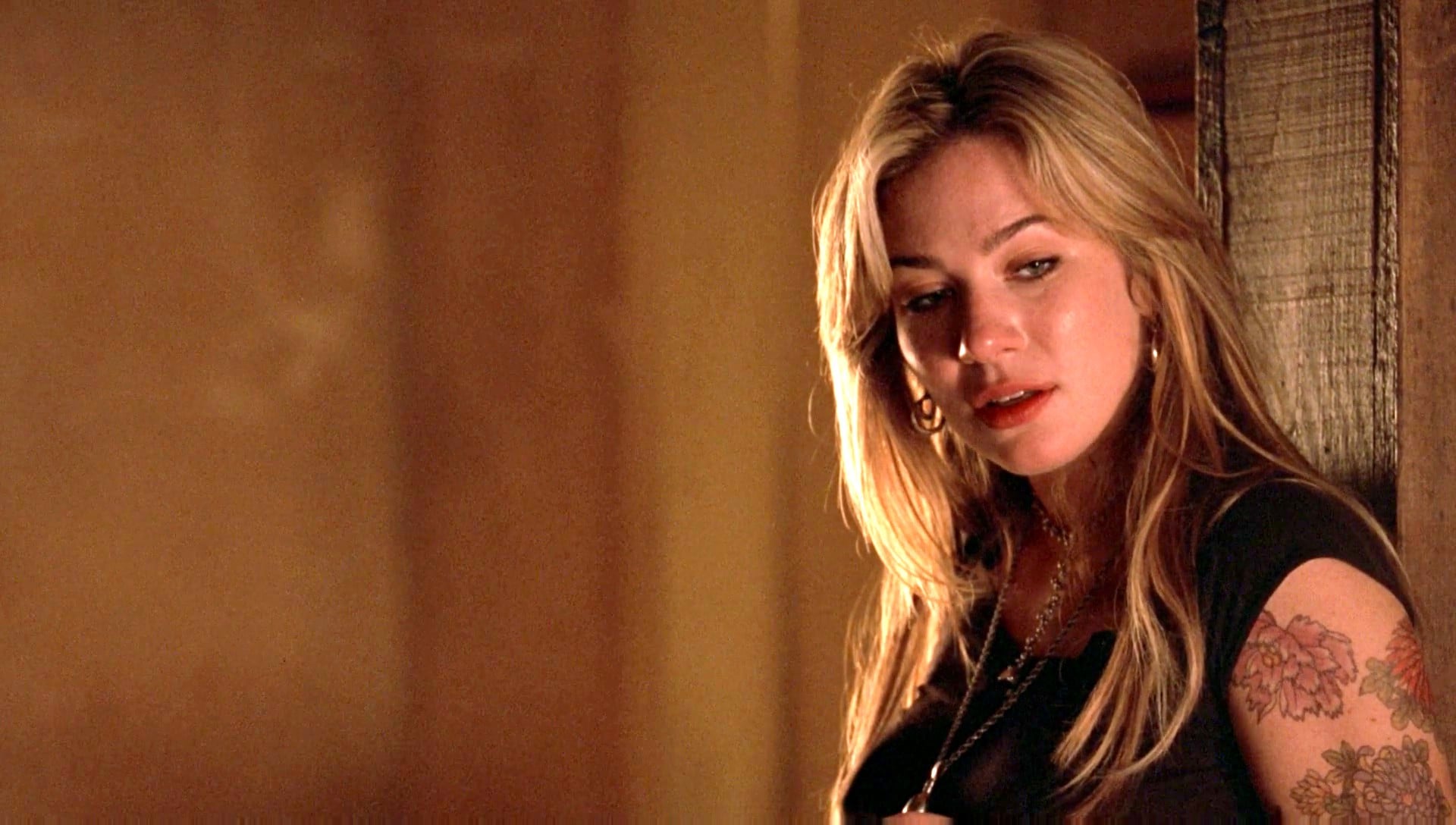 Description: A woman with a tattoo on her arm looking at a cell phone in a room with a curtain and a window.
