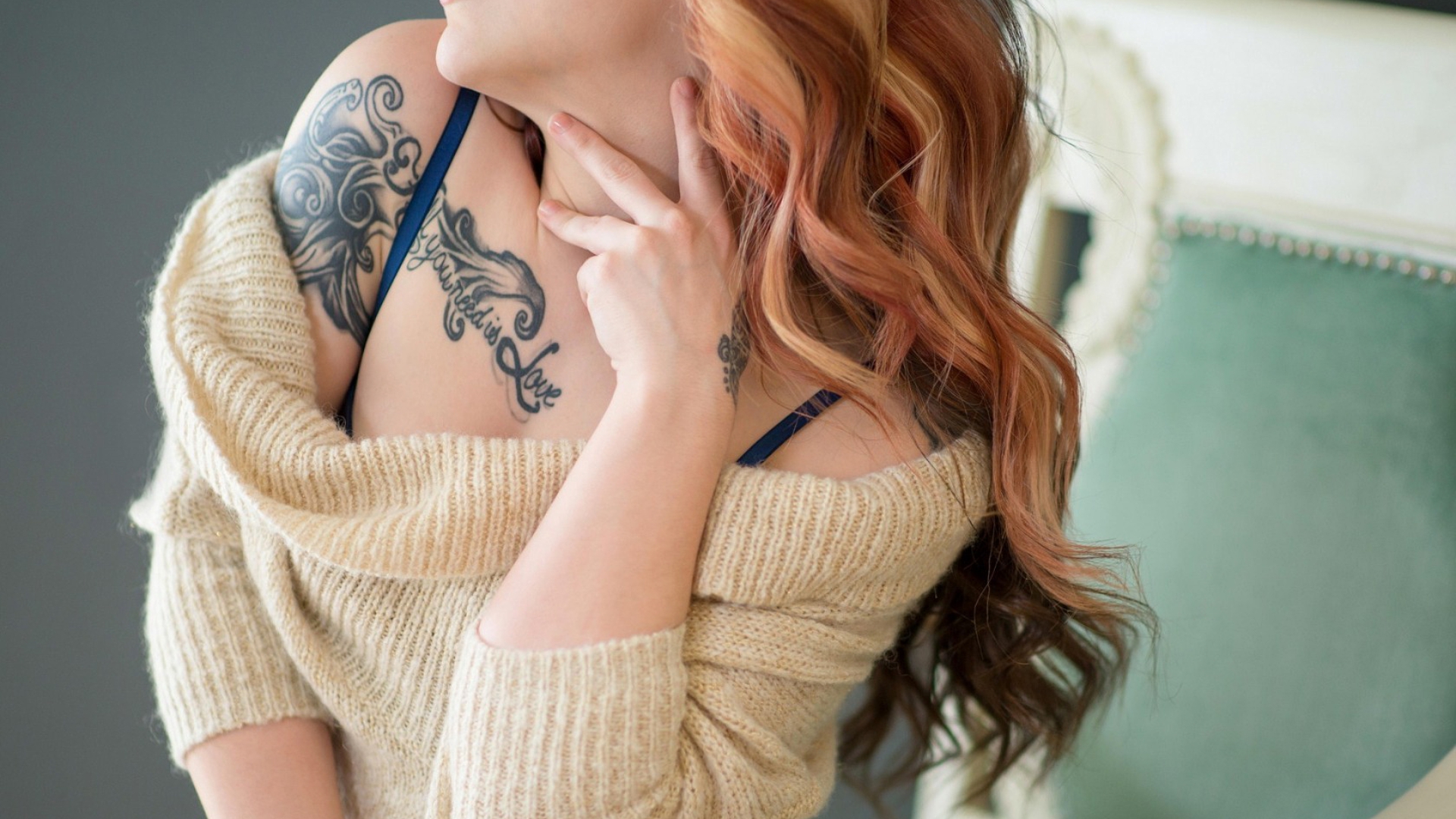 Description: A woman with a tattoo on her chest is looking at her reflection in a mirror and holding her hand to her chest.