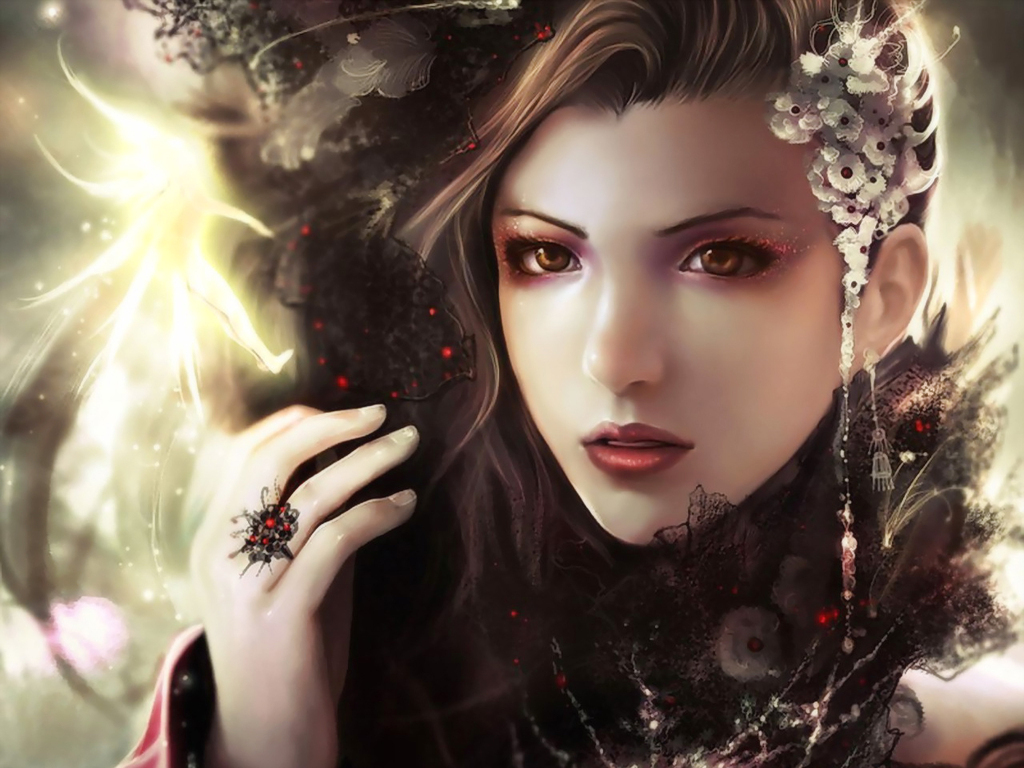 Description: A woman with a tiara and a ring on her finger and a butterfly on her head.