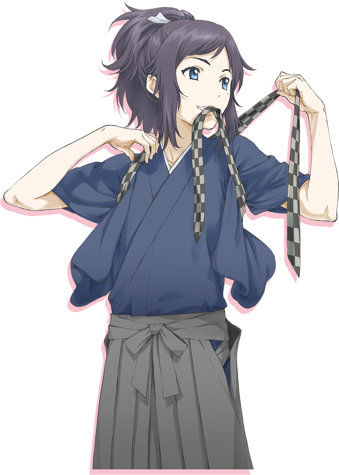 Description: A woman with a tie around her neck and a blue shirt on her shoulders.