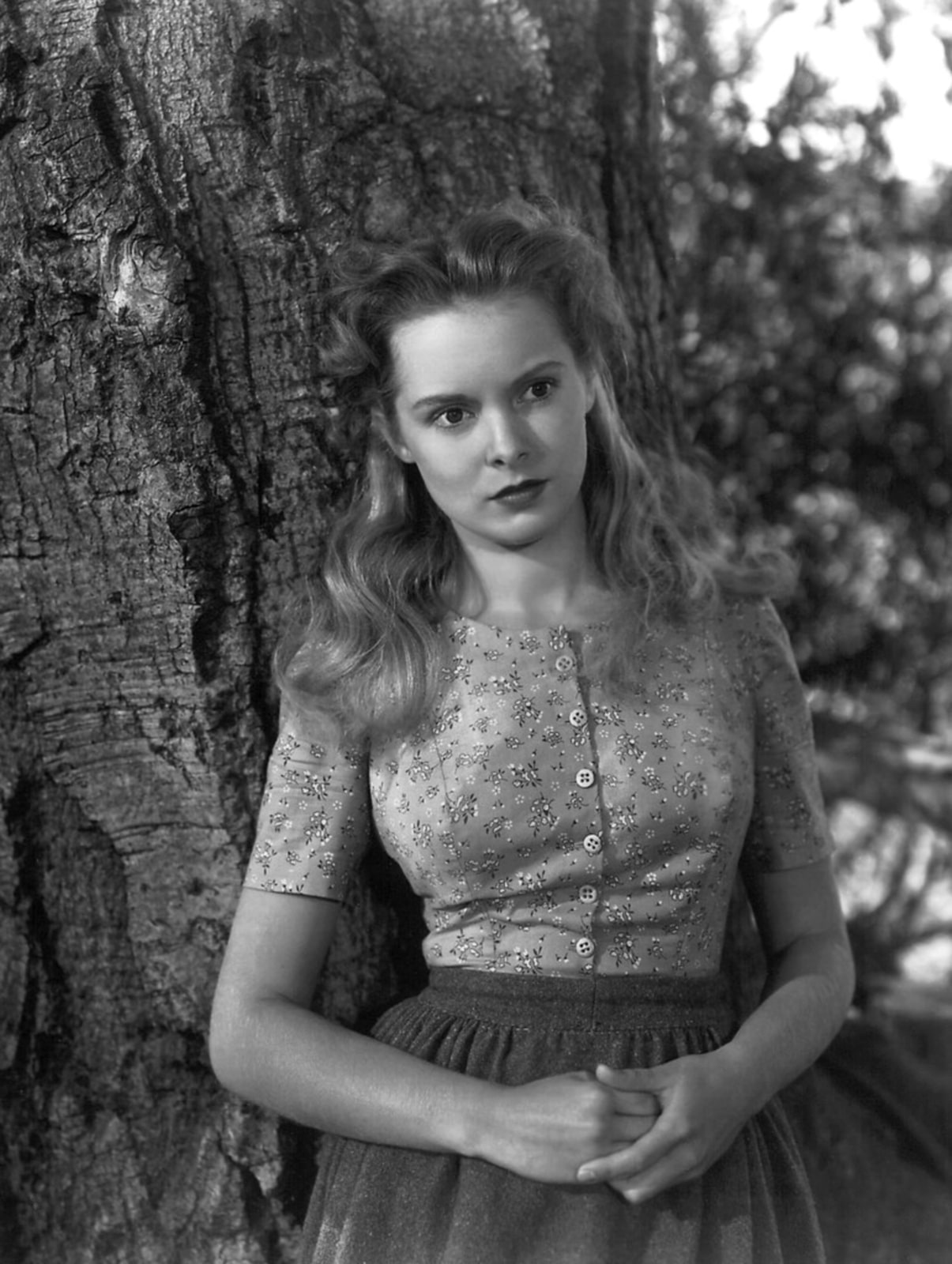 Description: A woman standing next to a tree in a dress and a hat on her head and a hand on her hip.