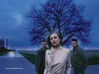Description: A woman standing in front of a tree with three men standing behind her on a road at night time.
