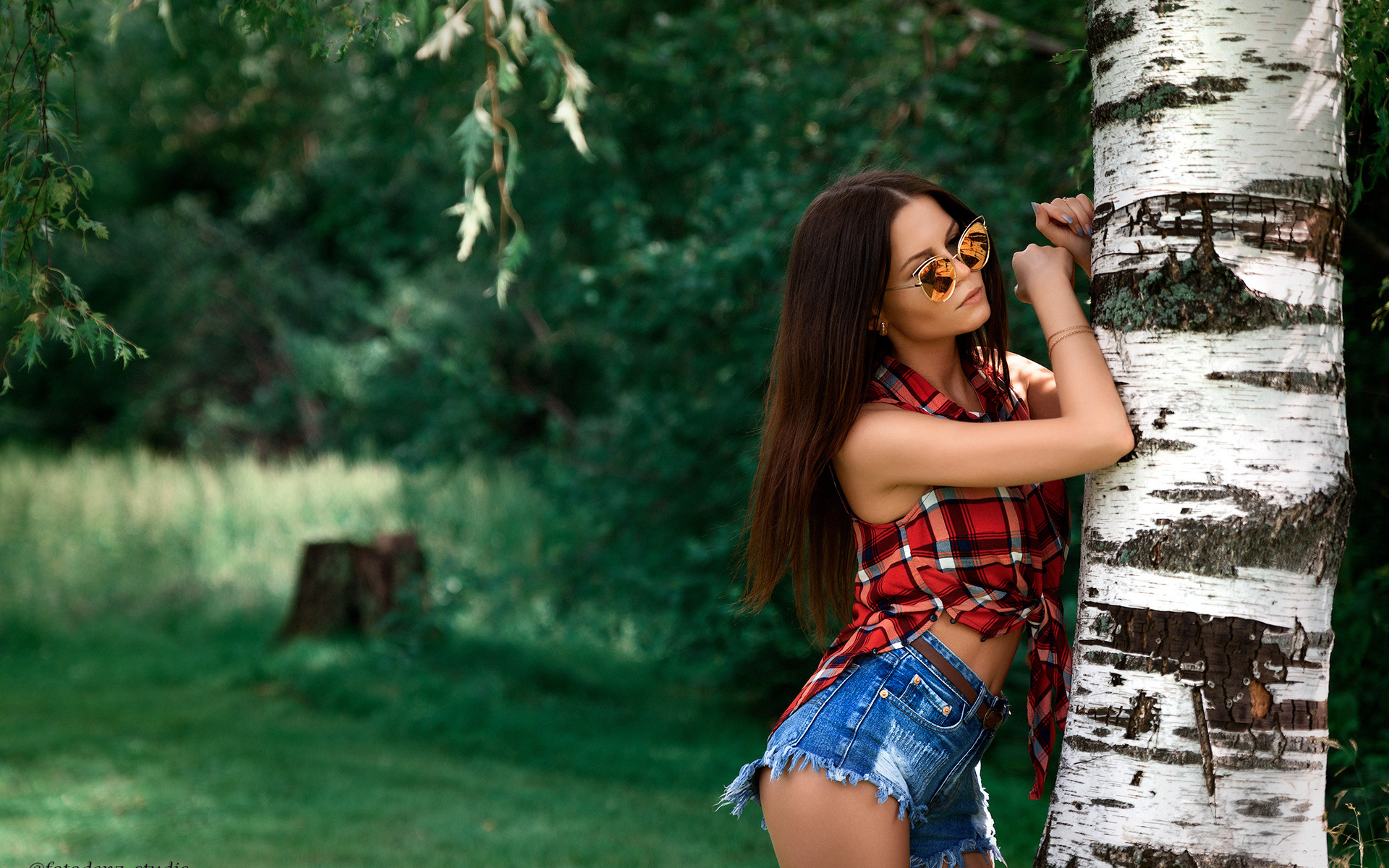 Description: A woman leaning against a tree in a park wearing a plaid shirt and denim shorts with a pair of sunglasses on her face.