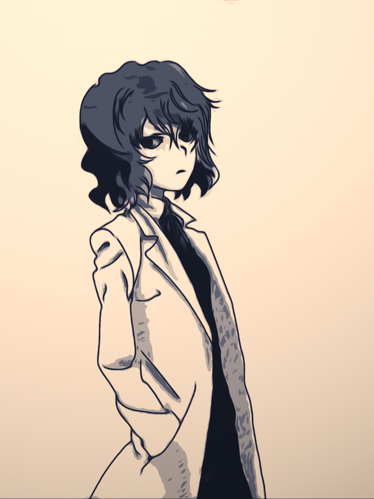 Description: A drawing of a woman in a trench coat and tie standing in front of a moon and a sky.