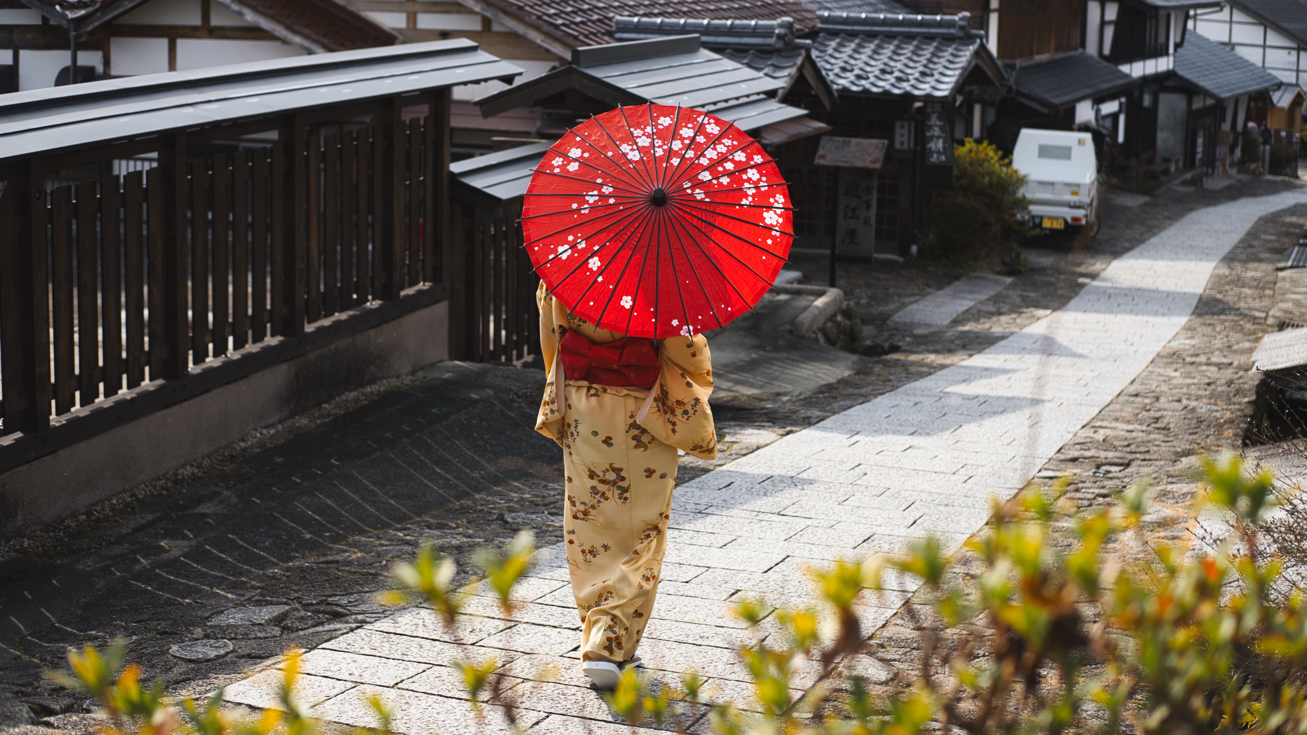 Description: A woman walking down a street holding a red umbrella over her head and a red umbrella over her head.