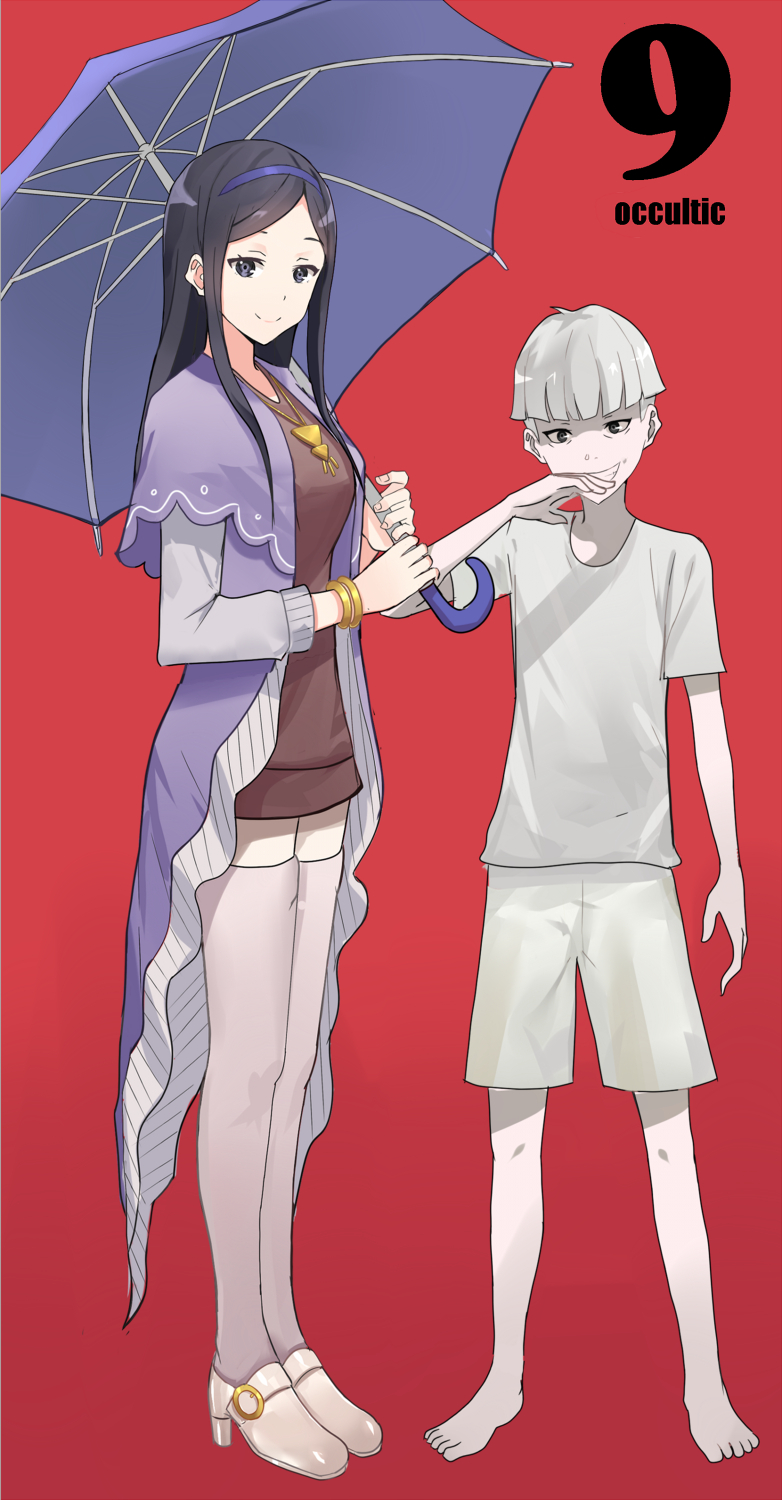 Description: A woman holding an umbrella next to a man in shorts and a shirt with a shirt on.