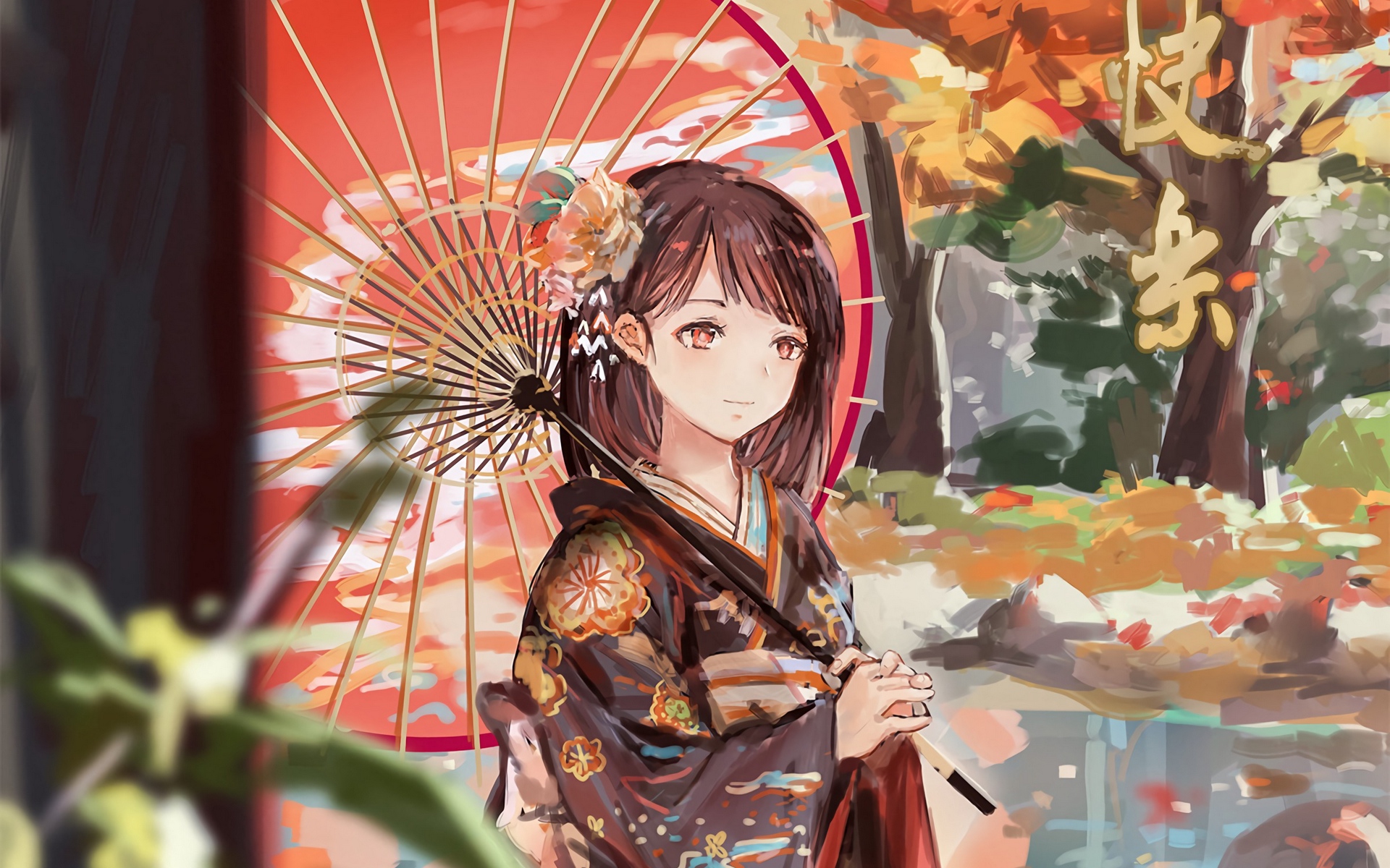 Description: A woman holding an umbrella in front of a painting of a woman with a parasol in her hand.