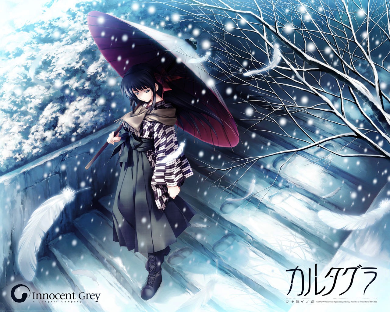 Description: A woman with an umbrella walking in the snow in winter time with snow falling on her head and trees in the background.