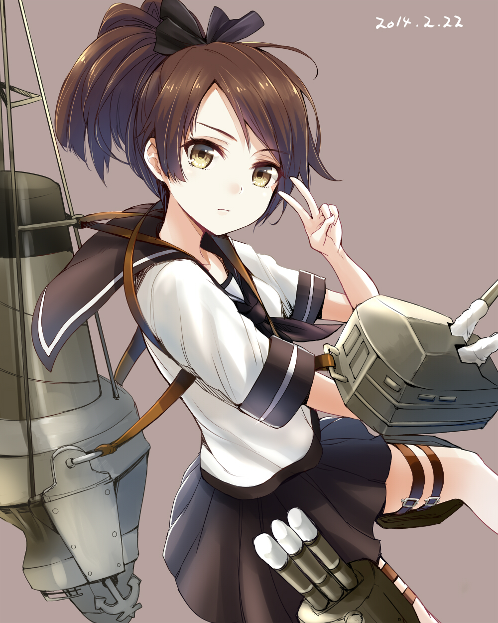 Description: A woman in a uniform holding a glove and a gun in her hand and a machine behind her back.