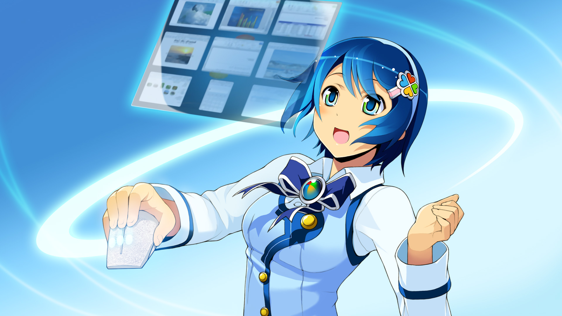Description: A woman in a uniform holding a paper and a cell phone in her hand and a blue background with a blue sky and clouds.