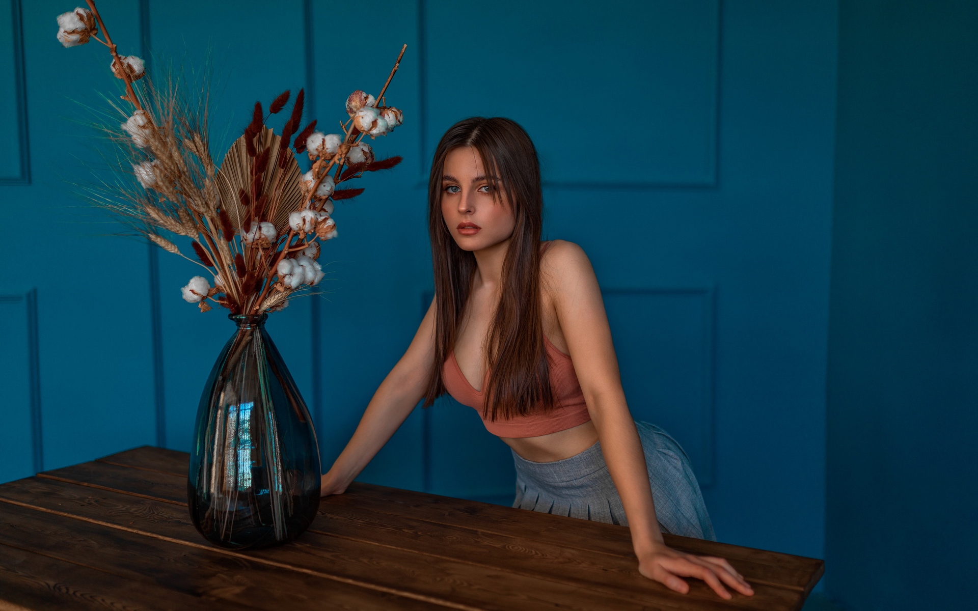 Description: A woman leaning on a table with a vase of flowers in front of her on a blue wall background.