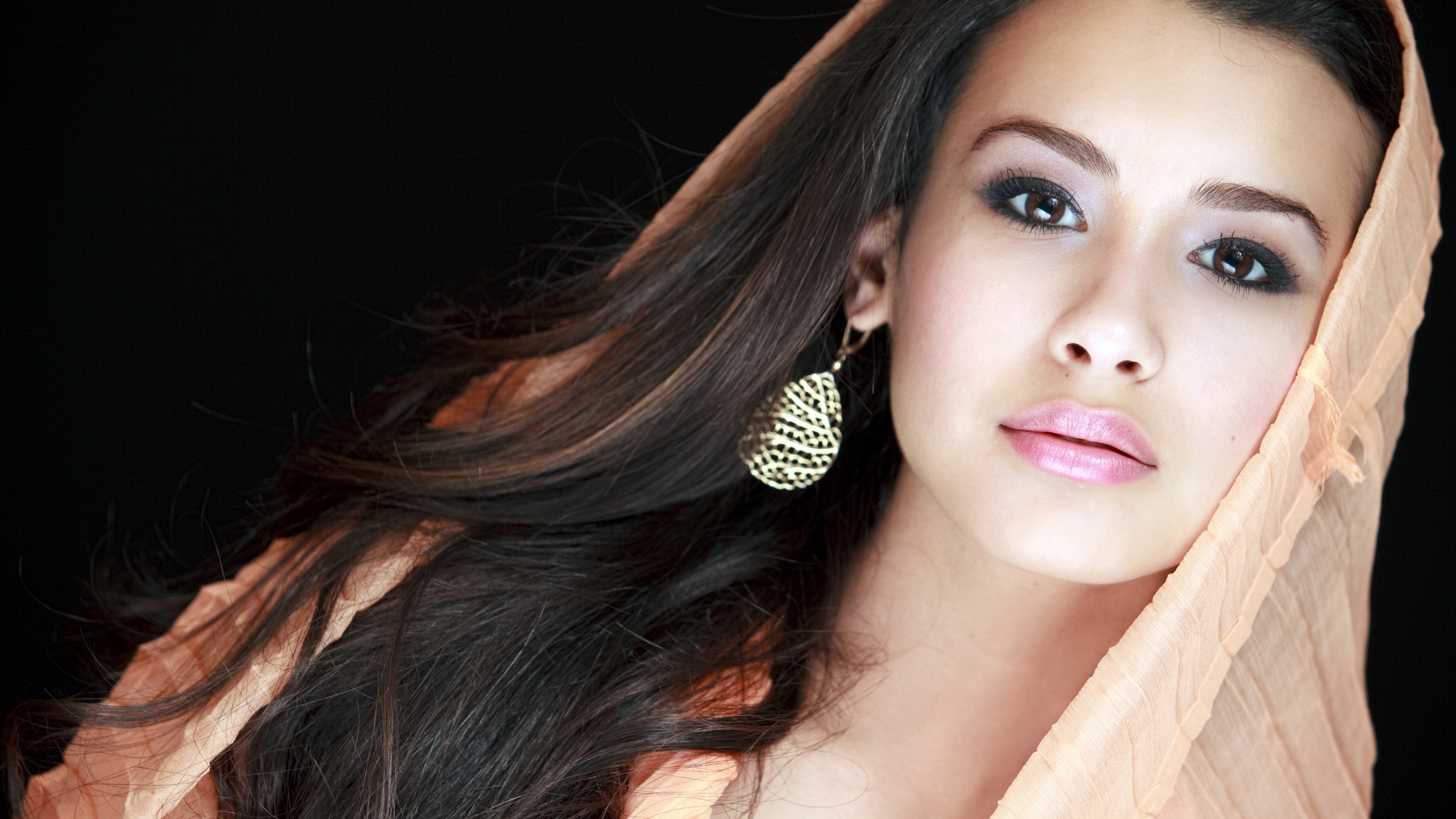Description: A woman with long hair wearing a veil and earrings on her head and a black background with a black backdrop.